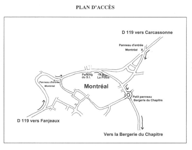 - en venant de Fanjeaux : suivre la route principale en direction de Carcassonne et, après l’office du tourisme, presque à la sortie de Montréal, prendre à droite devant La Poste, suivre la direction Piscine Camping jusqu’au rond point ;