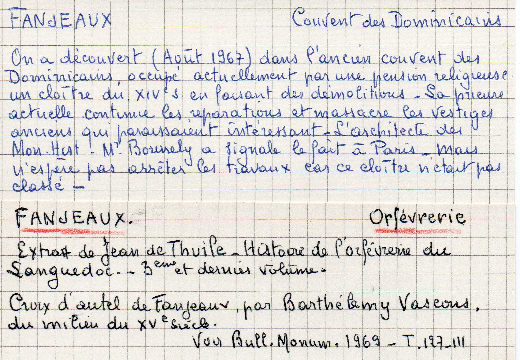 | Notes historiques et archéologiques sur Fanjeaux | Boyer Ch. | Fanjeaux | Archéologie | 1961 | T. LXII | p. 119 |