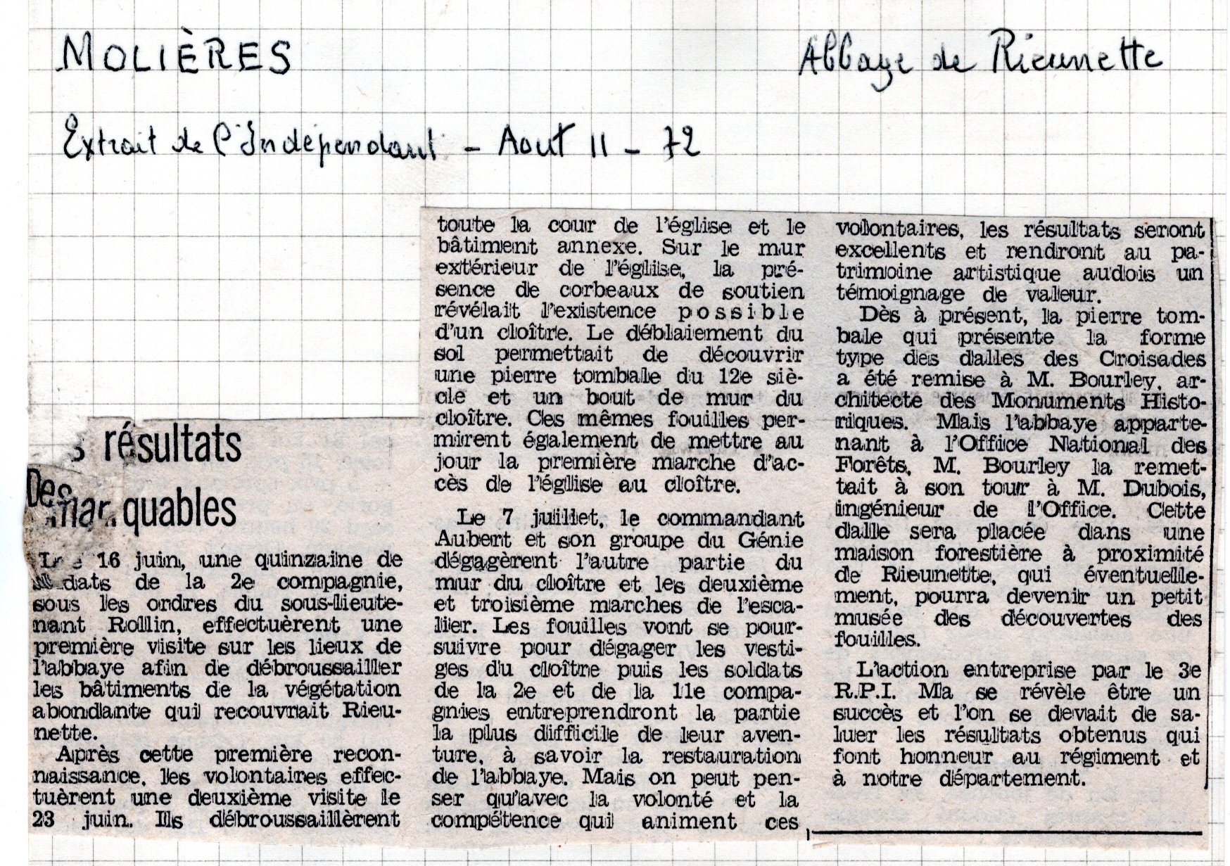 | Bornes de l’ancienne abbaye de Rieunette | Sorel H. | Rieunette | 1934 | T. XXXVIII | p. LXXI | |