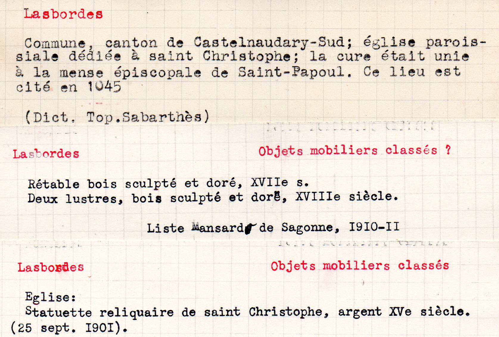| Le rétable baroque de l’église St-Christophe de Lasbordes | Azais R. | Lasbordes | Art religieux | 1977 | T. LXXVII | p. 119 |
