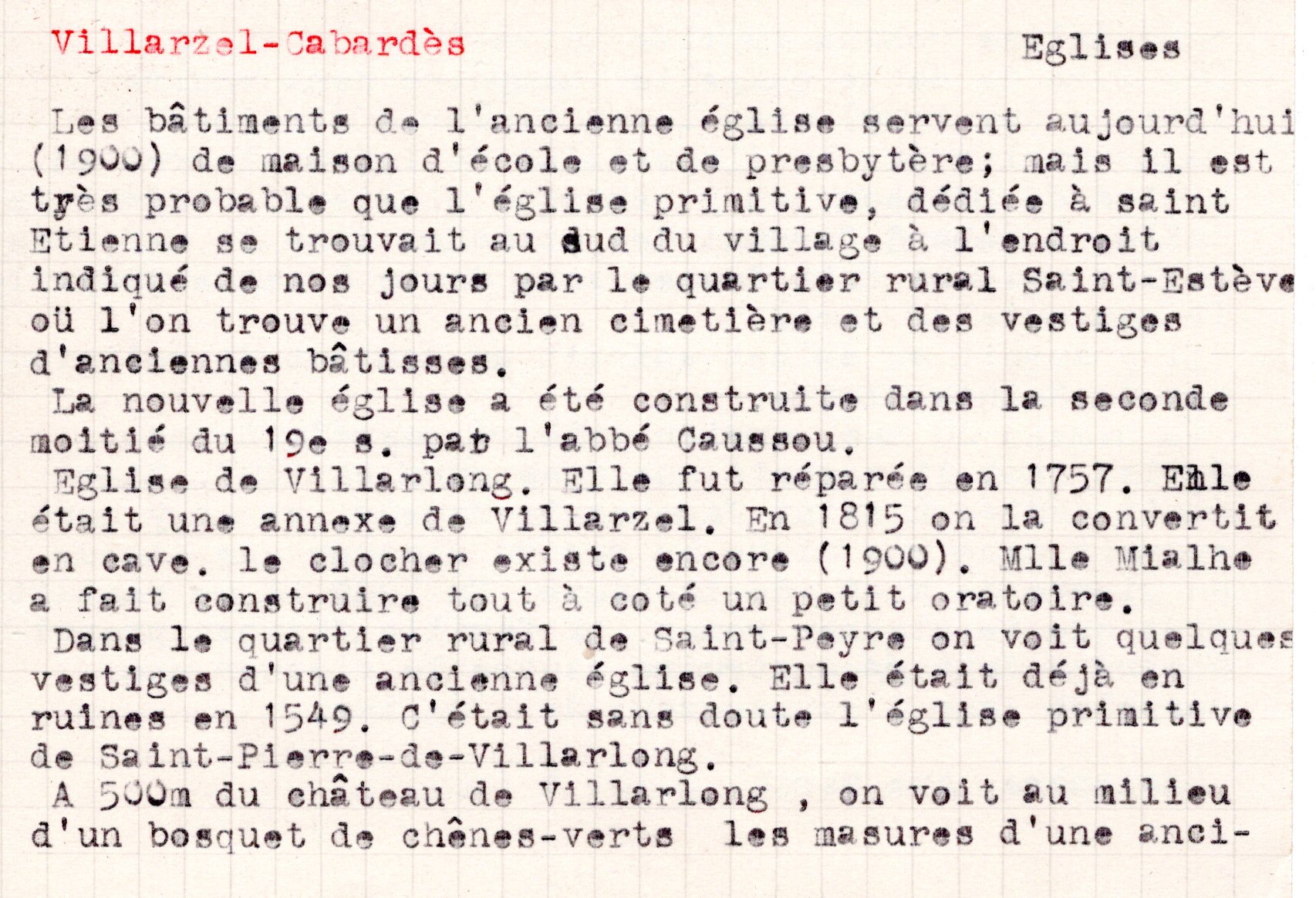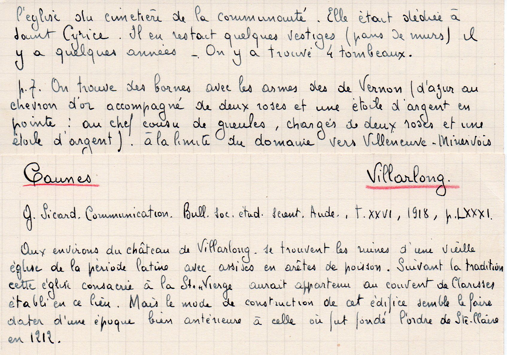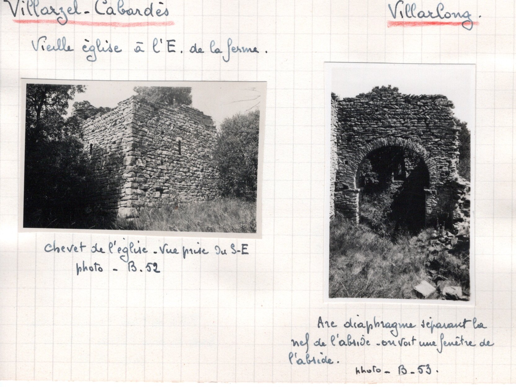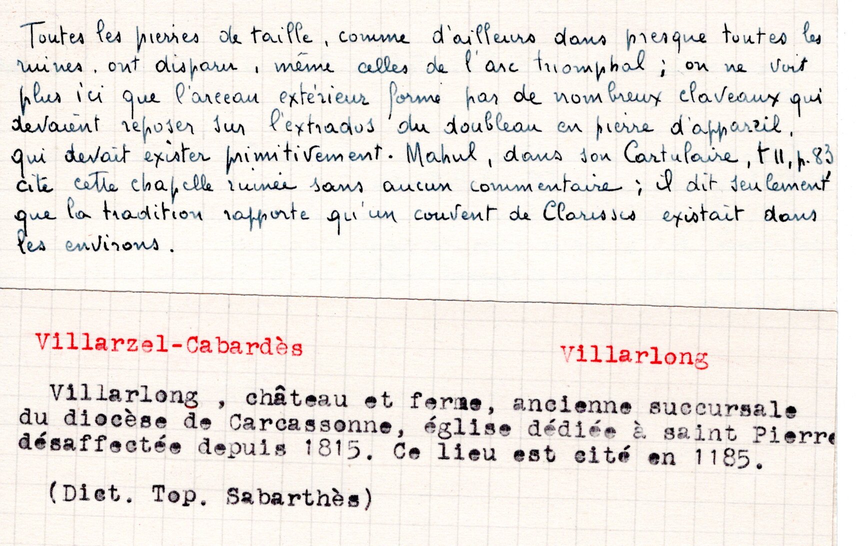 | Anciennes églises de Villarlong | Boyer Ch. | Villarzel-Cabardès | Architecture religieuse | 1943 | T. XLVI | p. CXX |