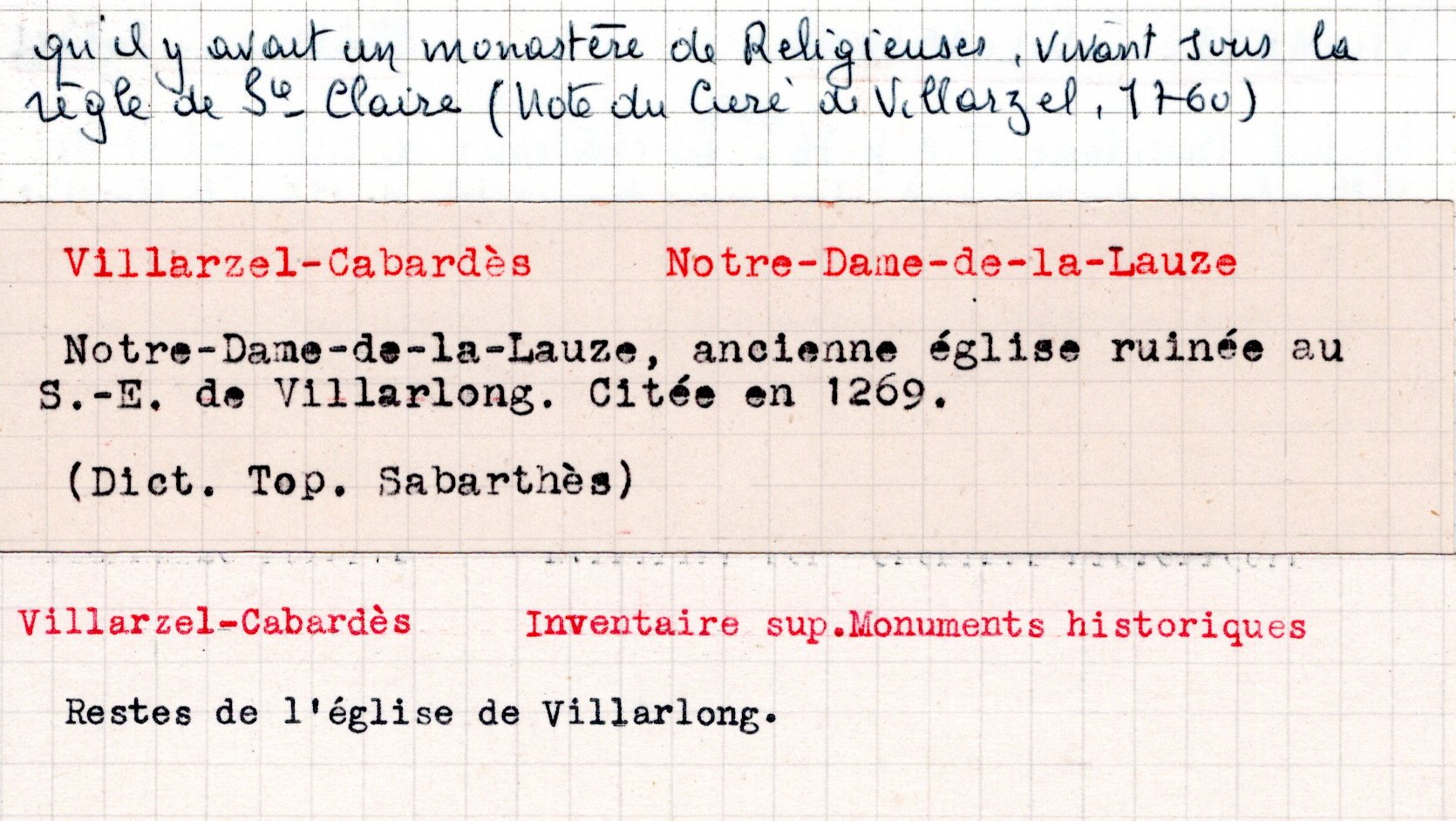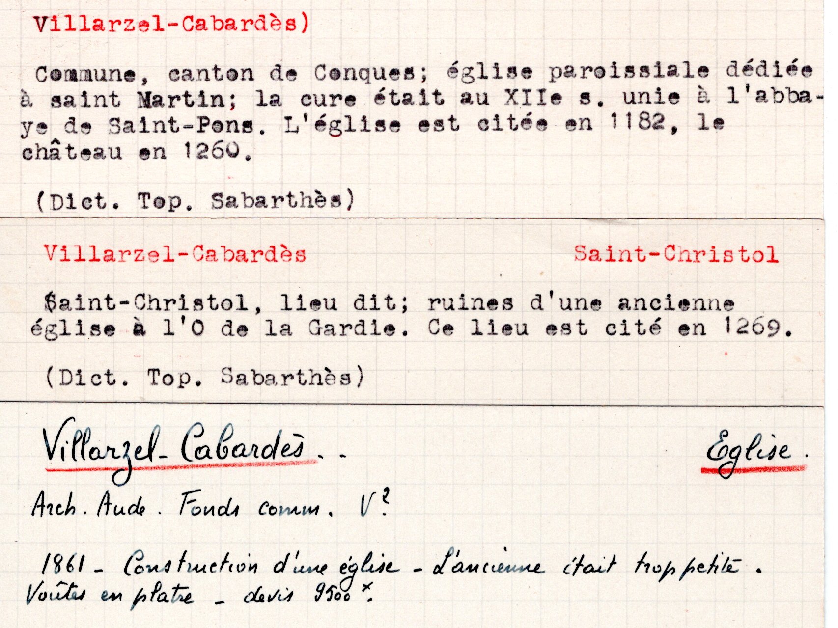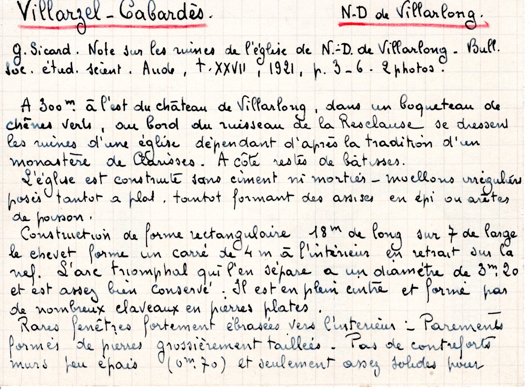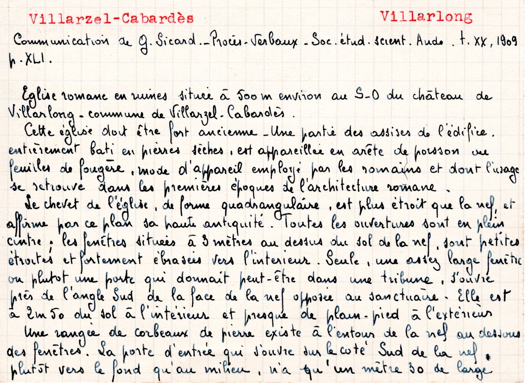 | Anciennes églises de Villarlong | Boyer Ch. | Villarzel-Cabardès | Architecture religieuse | 1943 | T. XLVI | p. CXX |