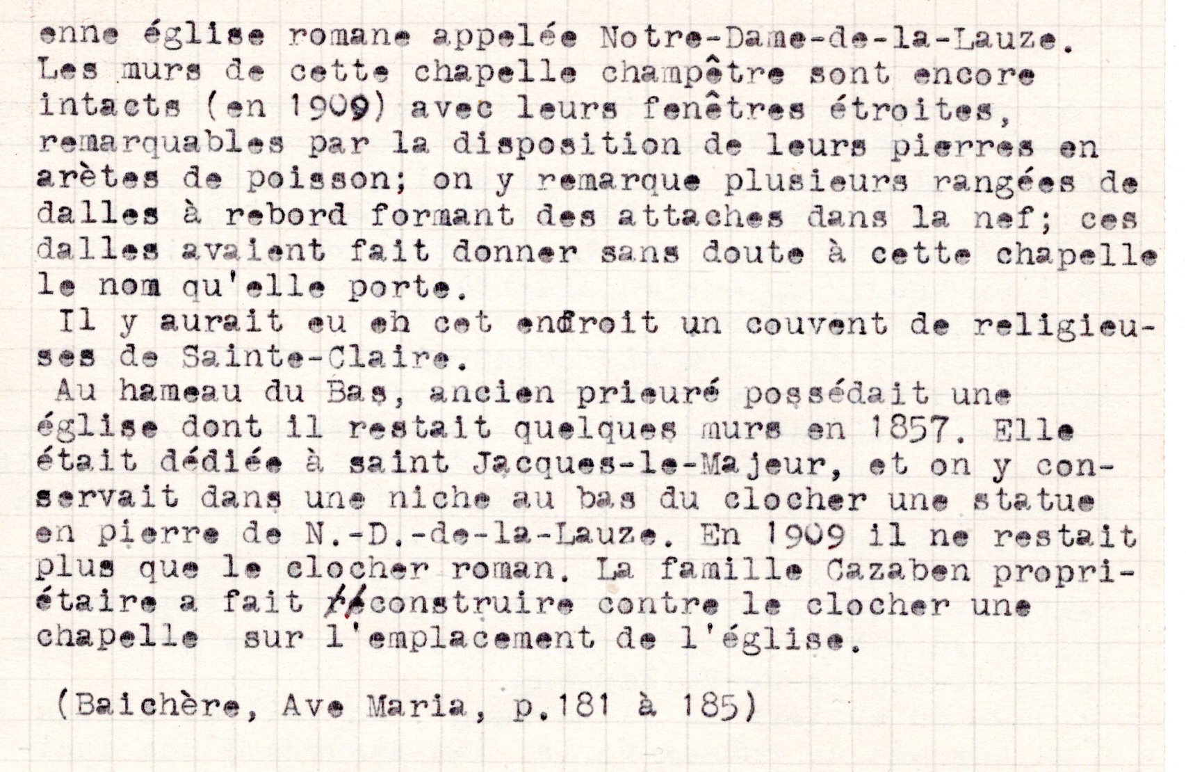 | La chapelle préromane « Notre-Dame de la Lauze » | Cattanéo D. Guiraud L. | Villarzel-Cabardès | Monuments religieux | 2011 | T. CXI | P ; 29 |