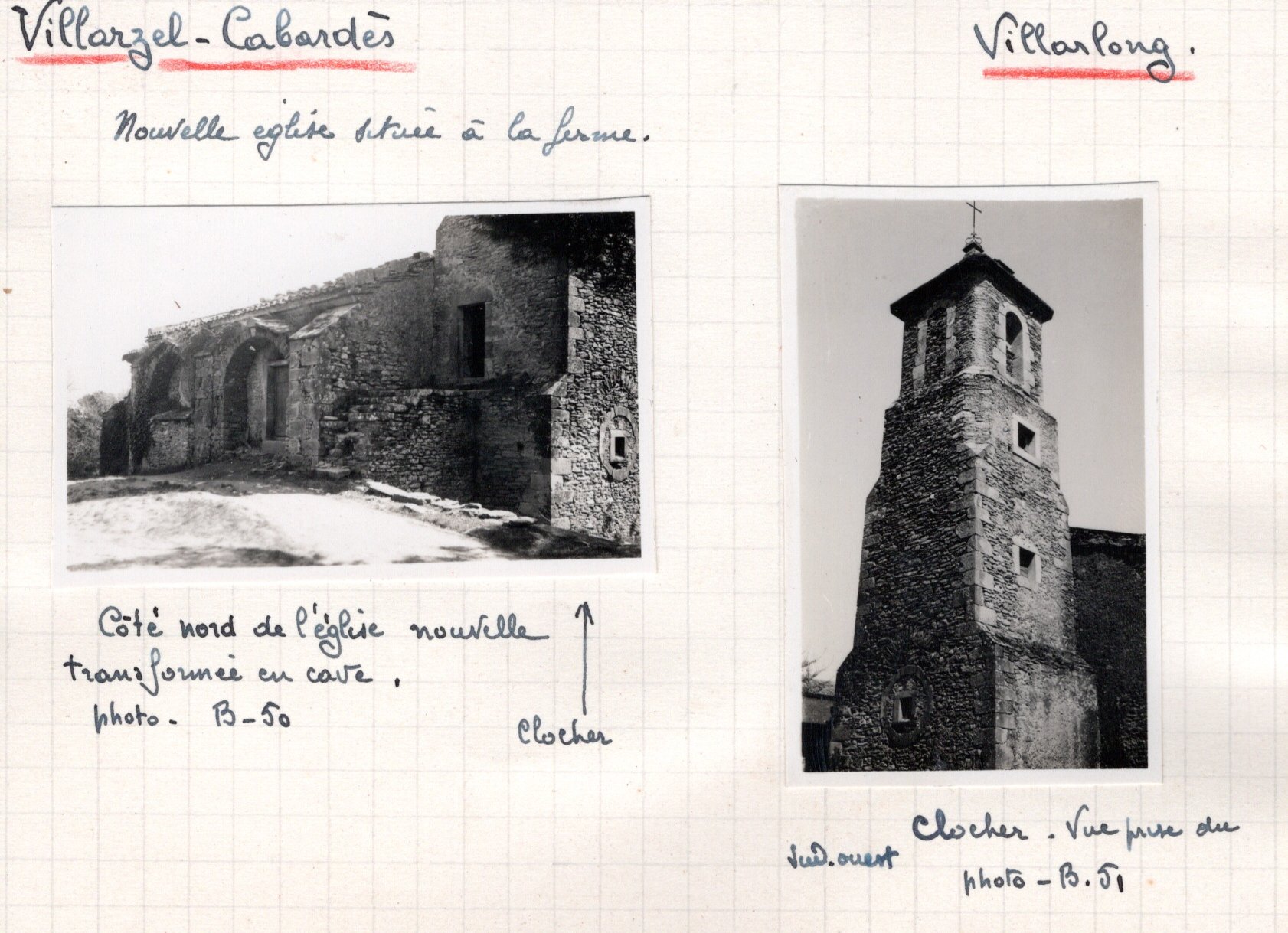 | Eglise de Notre-dame de Villarlong, chapelle moderne et clocher roman de la métairie du Bas | Sicard G. | Villarzel-Cabardès | Architecture religieuse | 1909 | T. XX | p. XLI |