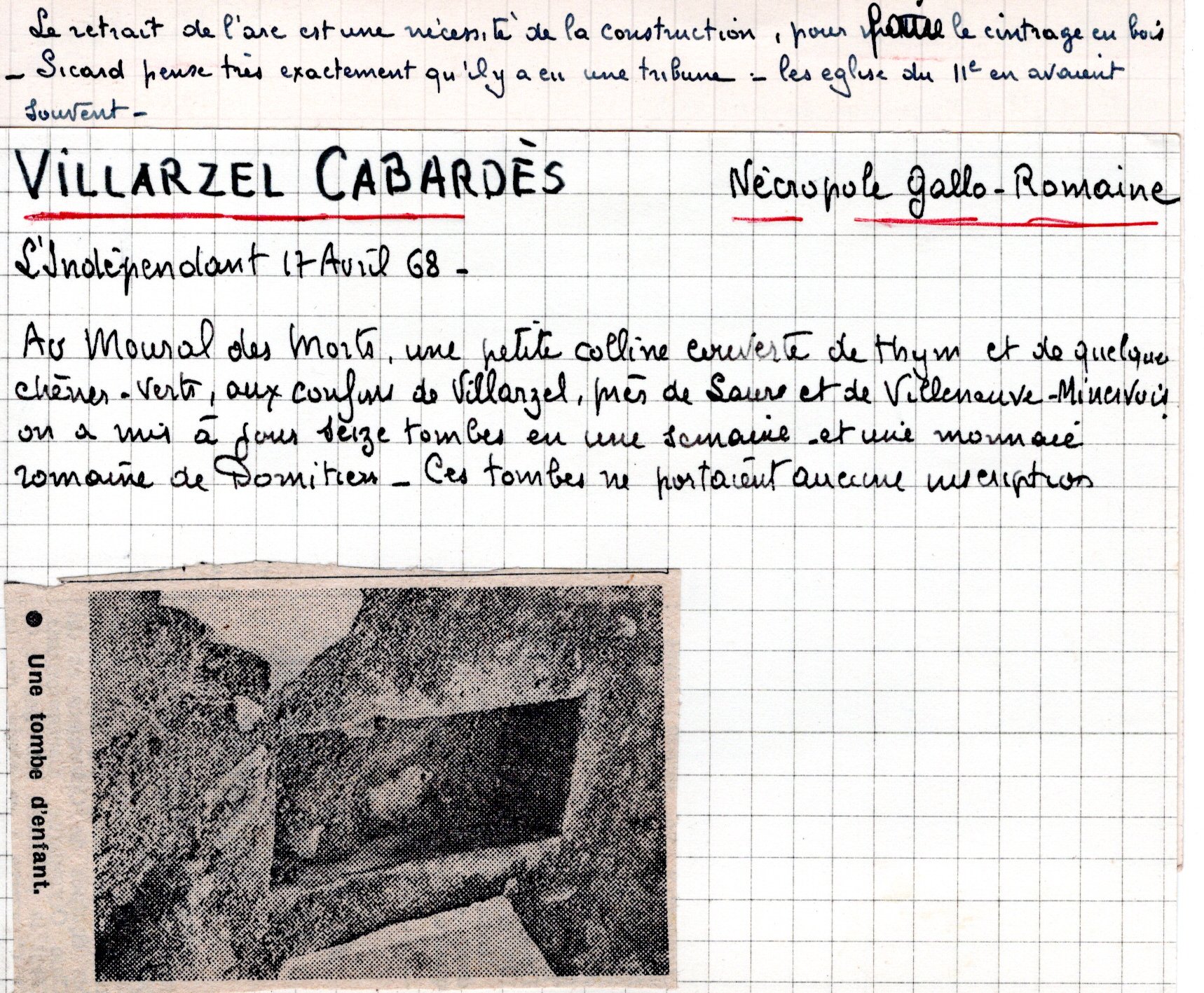 | Une nécropole de Villarzel | Girou J. | Villarzel-Cabardès | Archéologie | 1957 | T. LVIII | p. 30 et 40 |