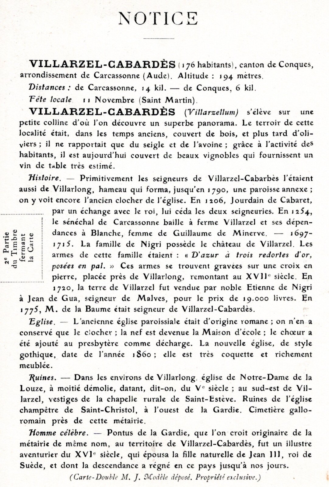La première image du fichier Boyer reproduite ci-dessous concerne Villarlong et a été attribuée dans le document initial à Caunes-Minervois, la partie supérieure de la vue ne concerne donc pas Villarzel-Cabardès.