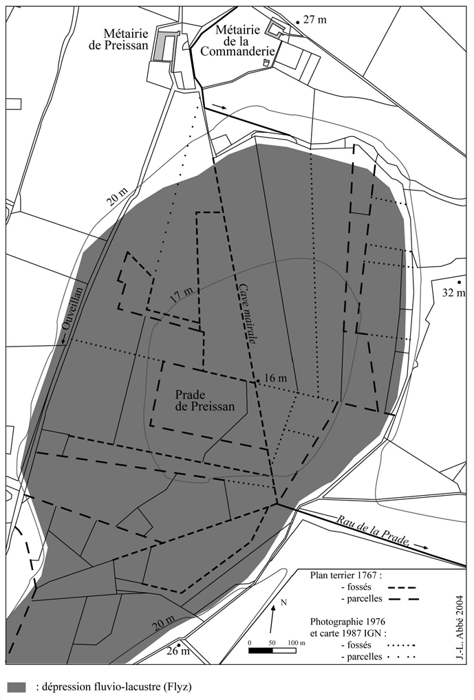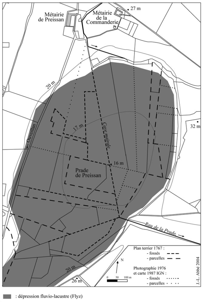 Le parcellaire de l’étang asséché de Preissan (Ouveillan, Aude). D’après Abbé (J.-L.), « Parcellaire et terroir en Languedoc au Moyen Âge. L’apport des terriers et des plans-terriers à travers l’exemple d’Ouveillan (Aude). »…, 2002.