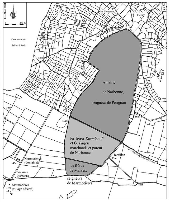 - Le partage de l’étang de Taraillan (Fleury-d’Aude, anc. Pérignan - Vinassan) en 1286 après son assèchement. D’après les documents médiévaux et un plan du début du xviie siècle reconstituant le partage à la fin du xiiie et au début du xive siècle (A. N., T 166/38). Plans cadastraux du début du xixe siècle.