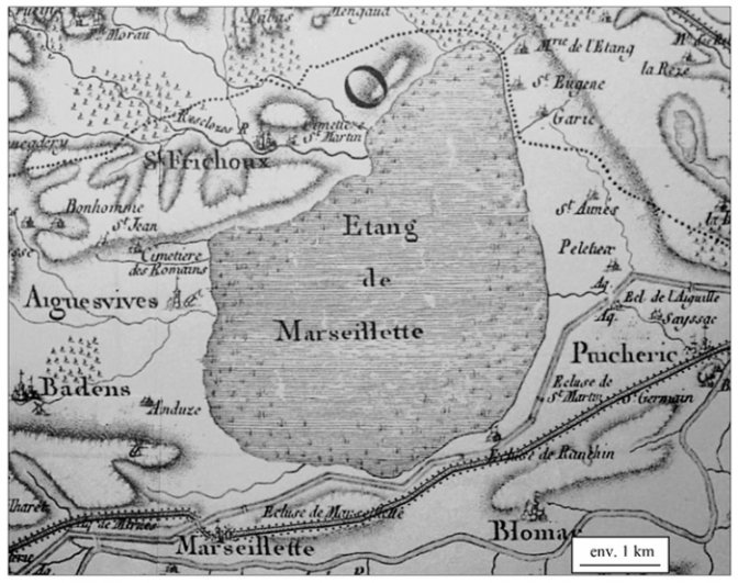 <centerL’étang de Marseillette au milieu du xviiie siècle d’après la carte de Cassini (archives de l’IGN, carte de Cassini, feuille no 19 Carcassonne).