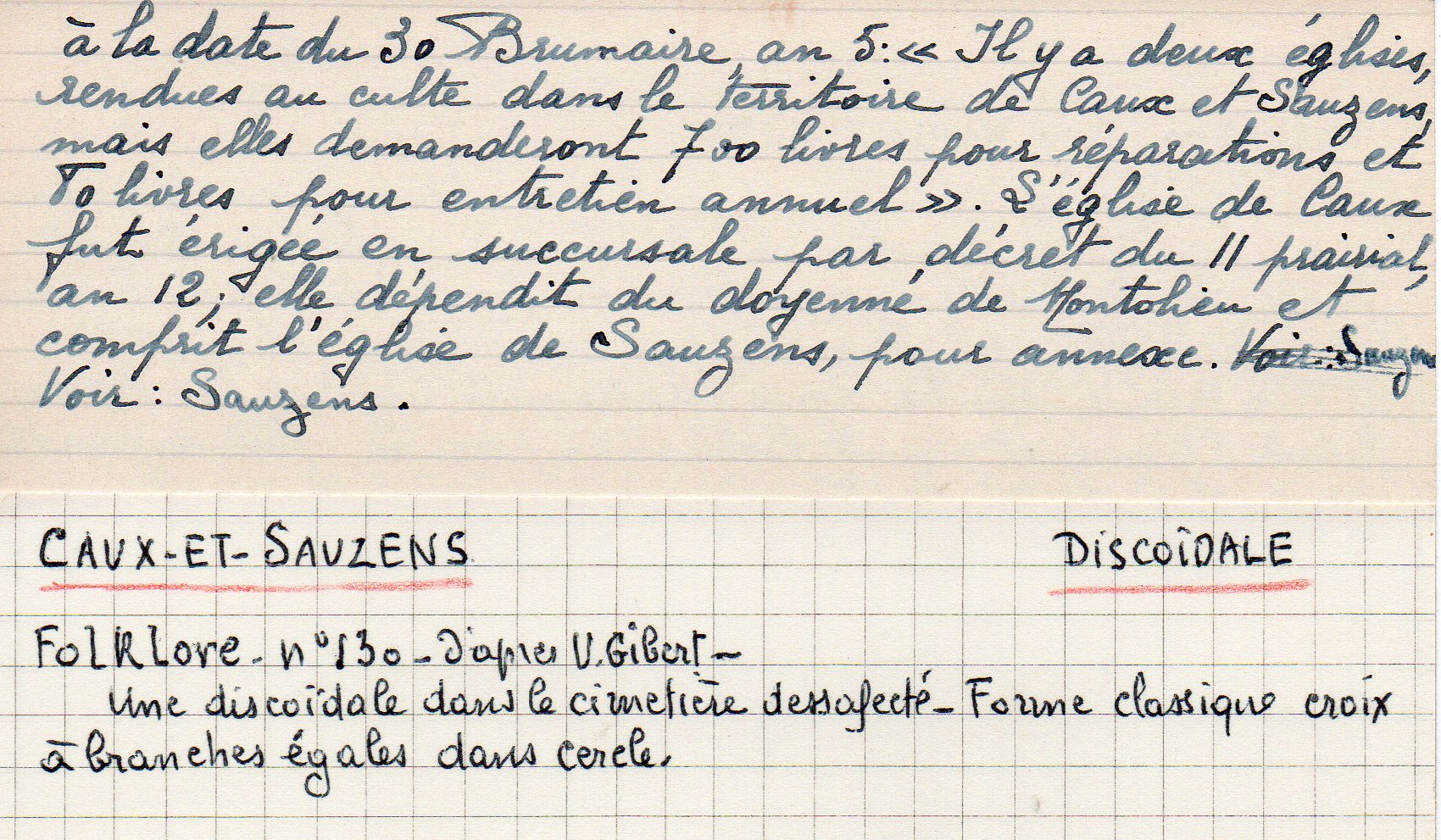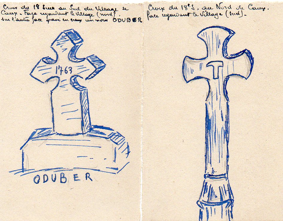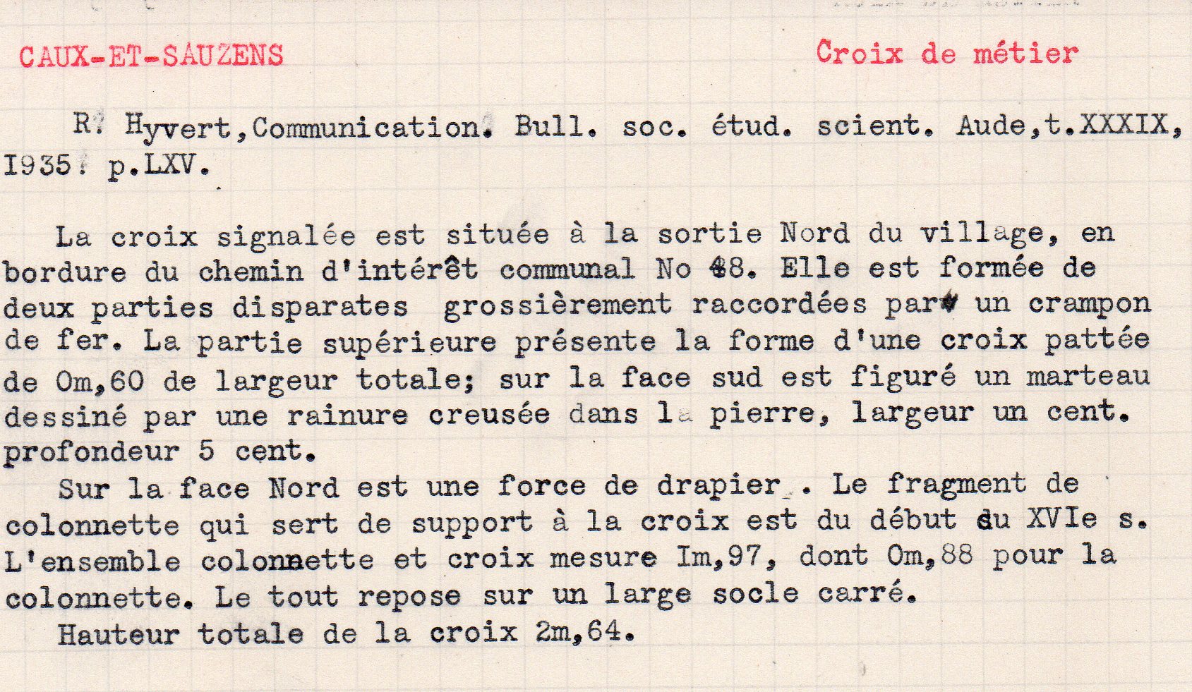 | Croix de métier à Caux et Sauzens. Marques de tâcherons | Hyvert H. | Caux-et-Sauzens | Histoire - Métiers | 1935 | T. XXXIX | p. LXV |