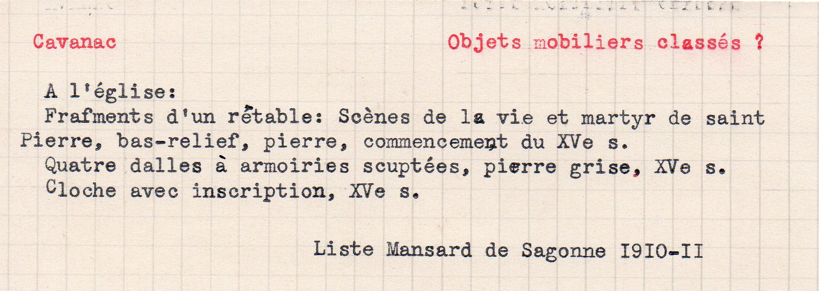 | Substructions (fours) | Fages A. | Cavanac | Archéologie période romaine et gallo-romaine | 1948 | T. XLIX | p. XLVI |