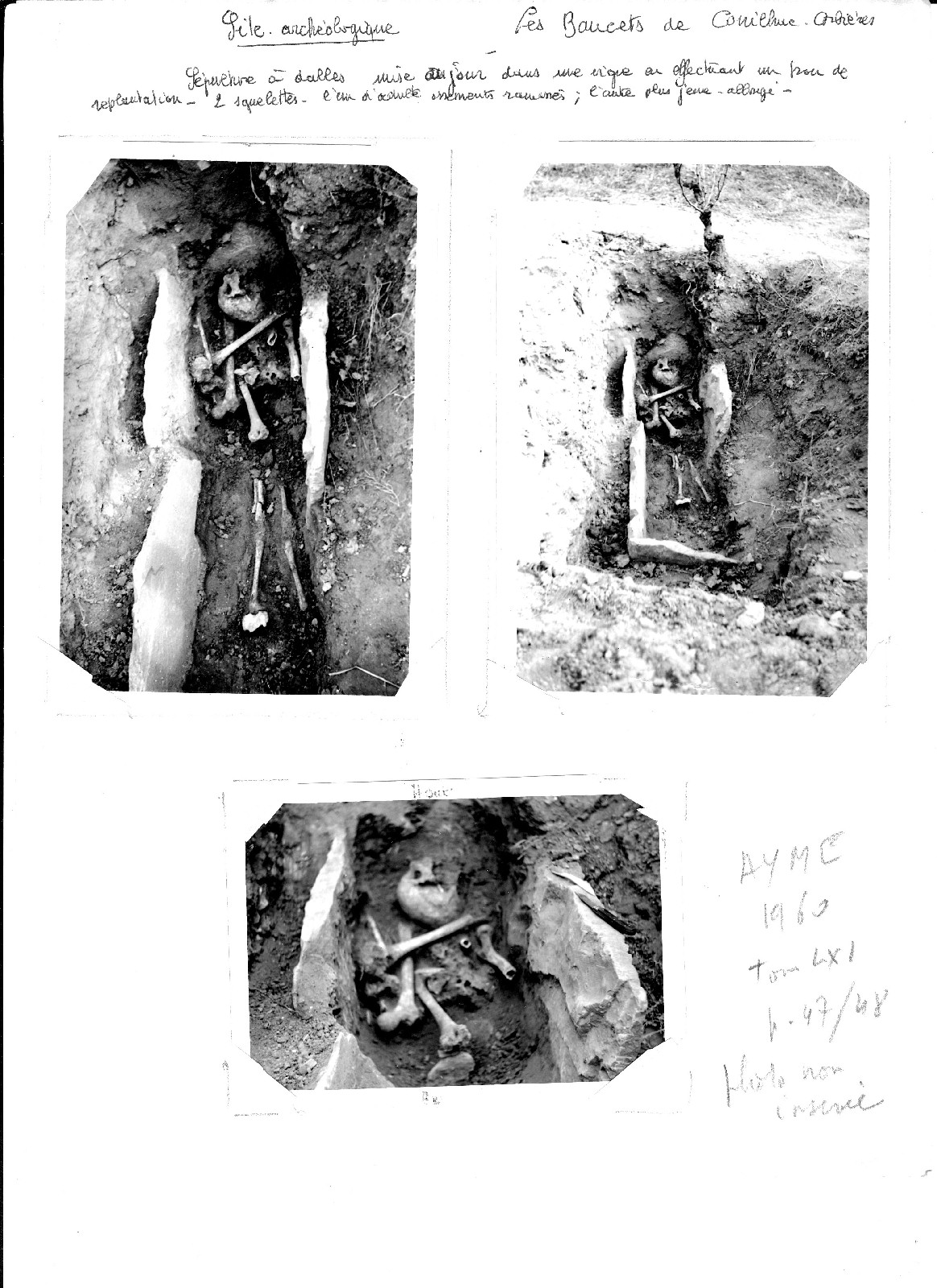 Sépulture à dalles mise à jour lors de la réalisation d’un trou de replantation dans une vigne. Voir le compte rendu par R. Aymé dans le bulletin LXI p. 47-48.