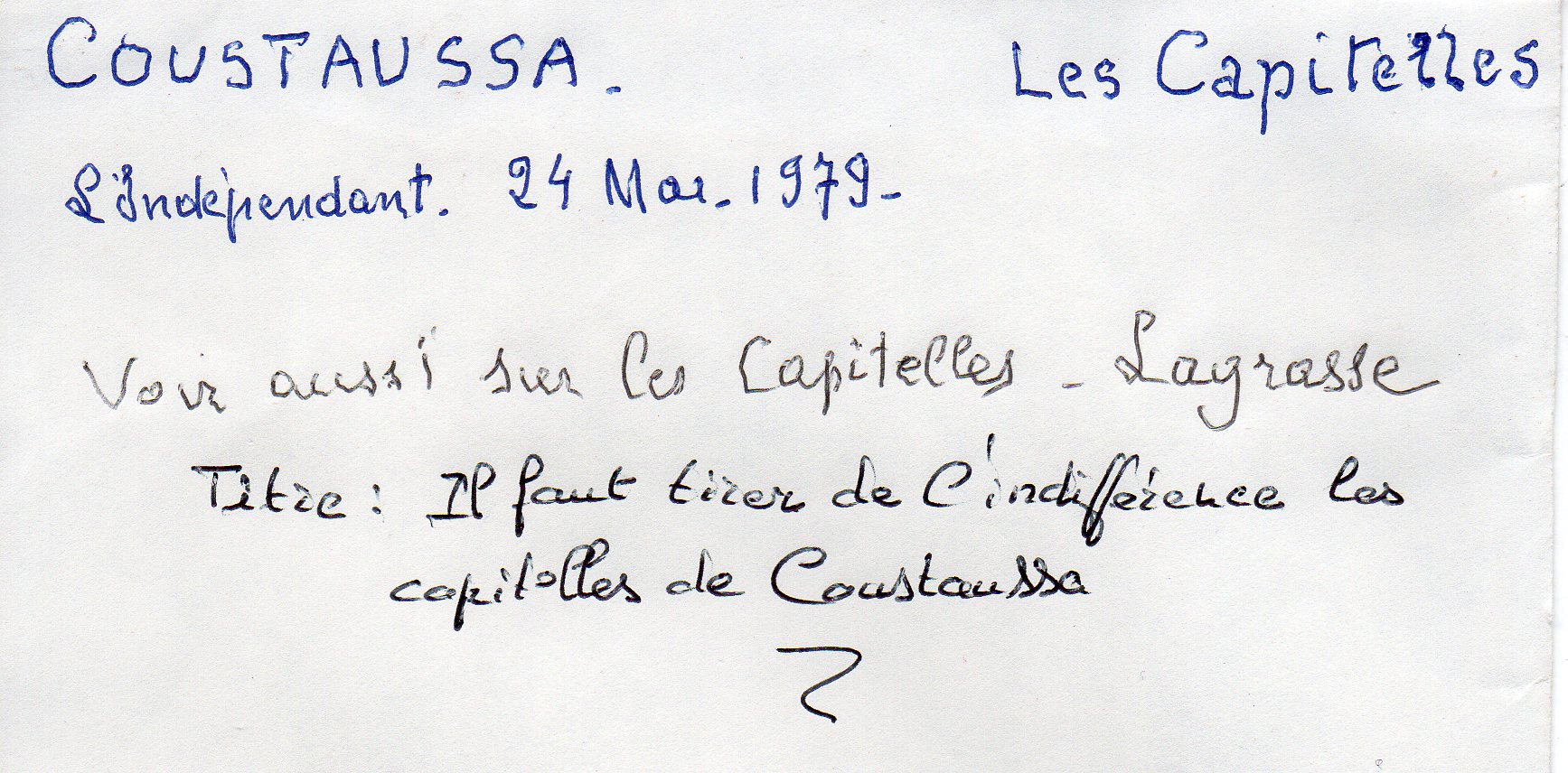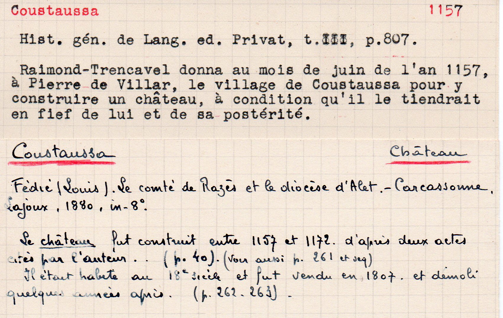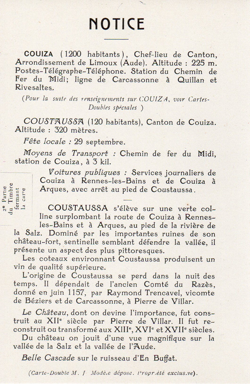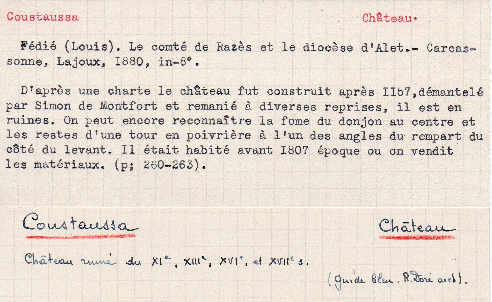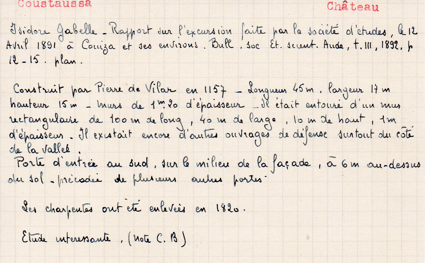 | Couiza et ses environs, Coustaussa | Gabelle I. | Couiza, Coustaussa | Excursion | 1892 | T. III | p. 11 |