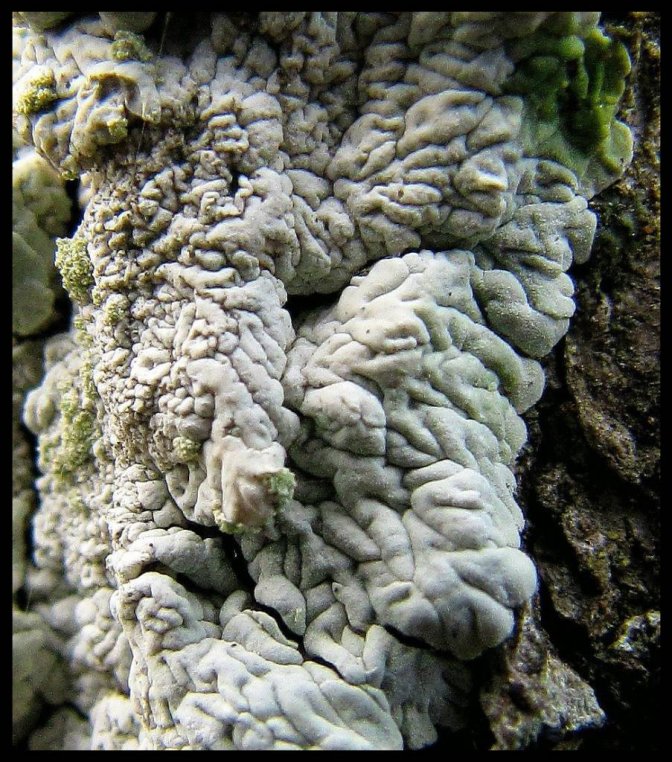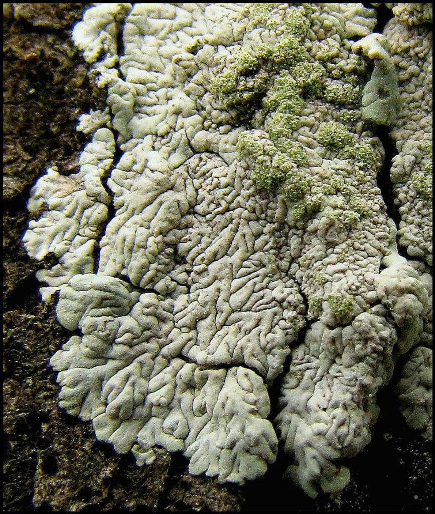 Détail du pourtour et des soralies situées au centre du thalle. Ce lichen est rarement fertile.