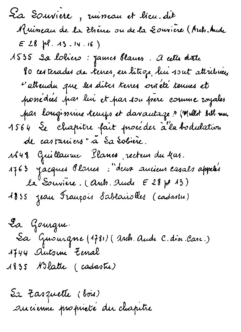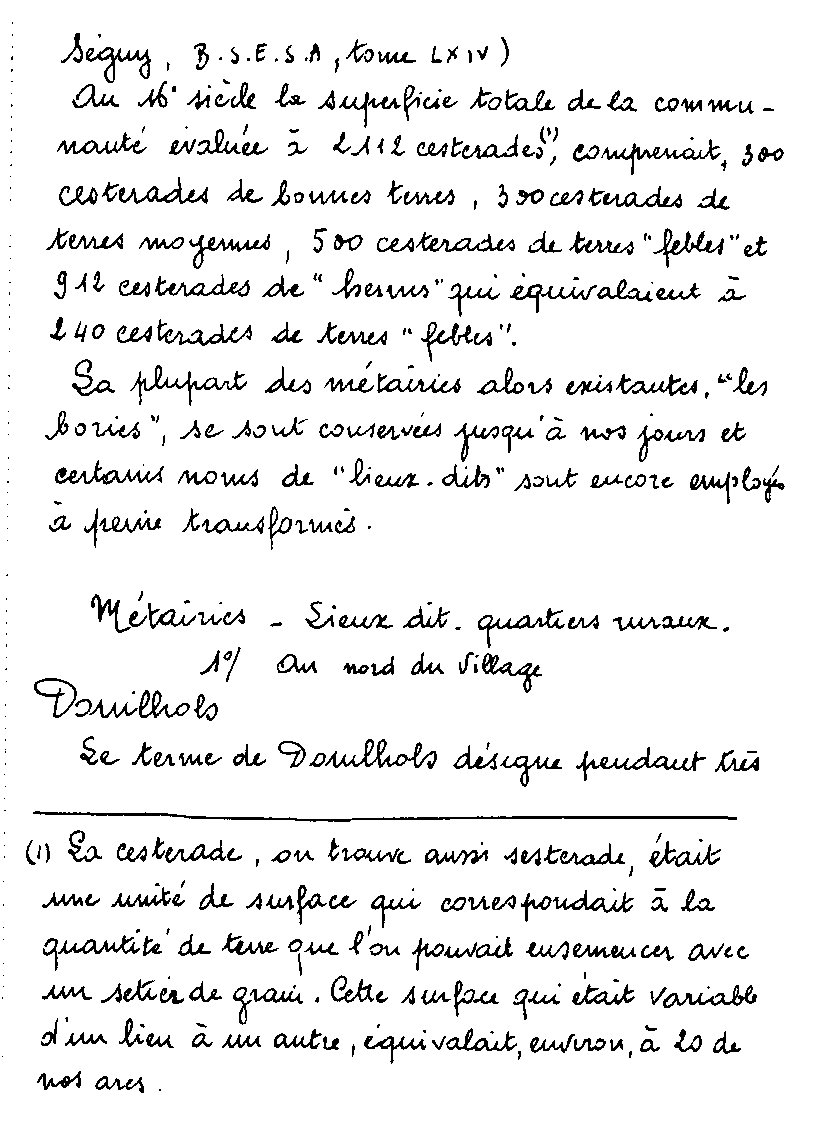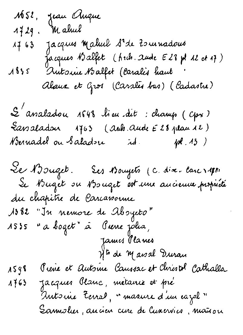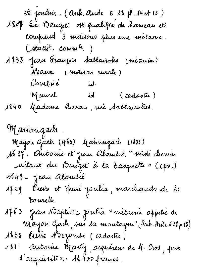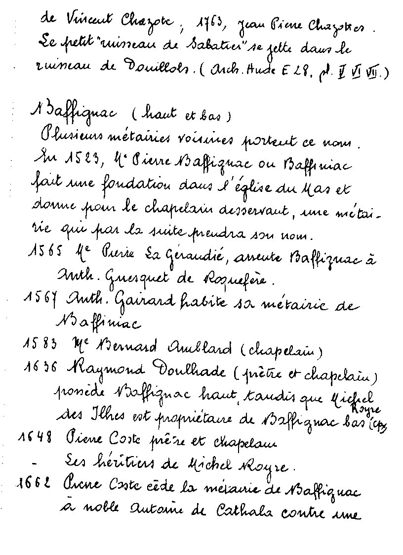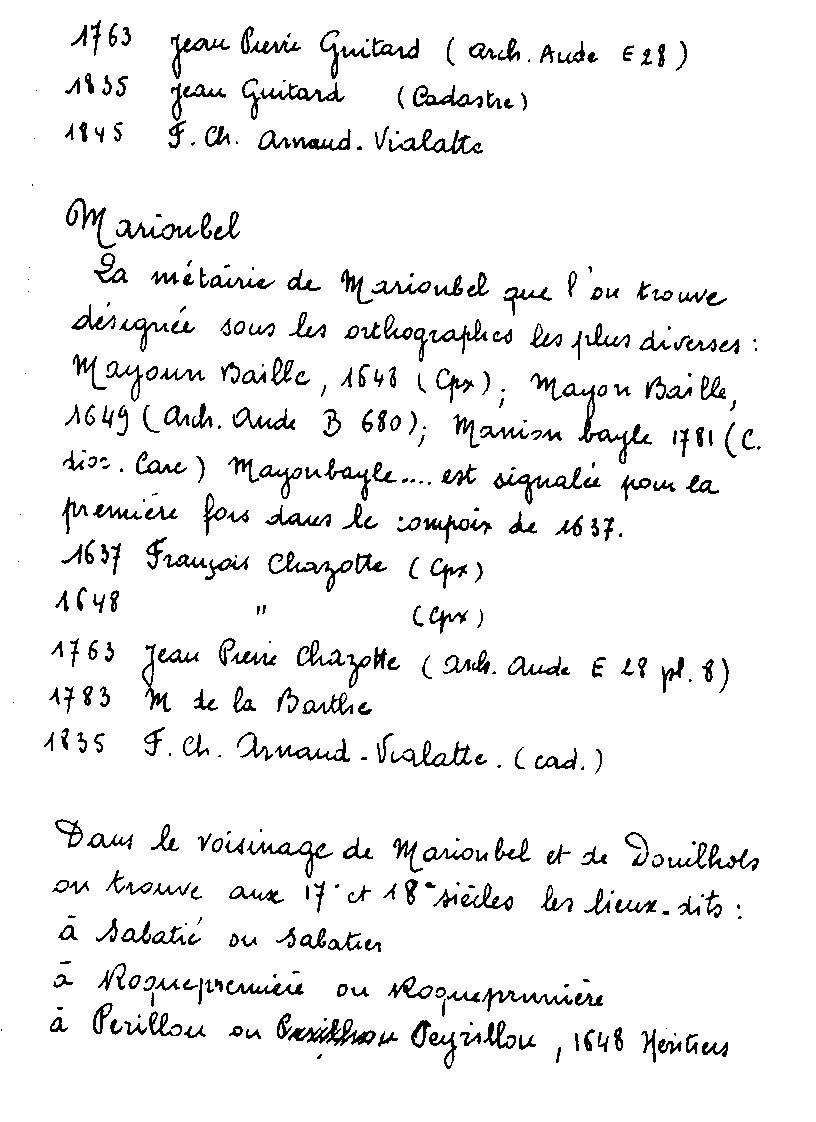 Étude topographique et toponymique, métairies, lieux-dits, quartier ruraux (Douilhos, Marionbel, Baffignac, Trescombelles, Fontparlière, La Ferrière, Faussou, Carrabès, Le Bouget, Mariongach, La Louvière, La Gourgne, La Tasquière, La Redoude, Les Moussels)