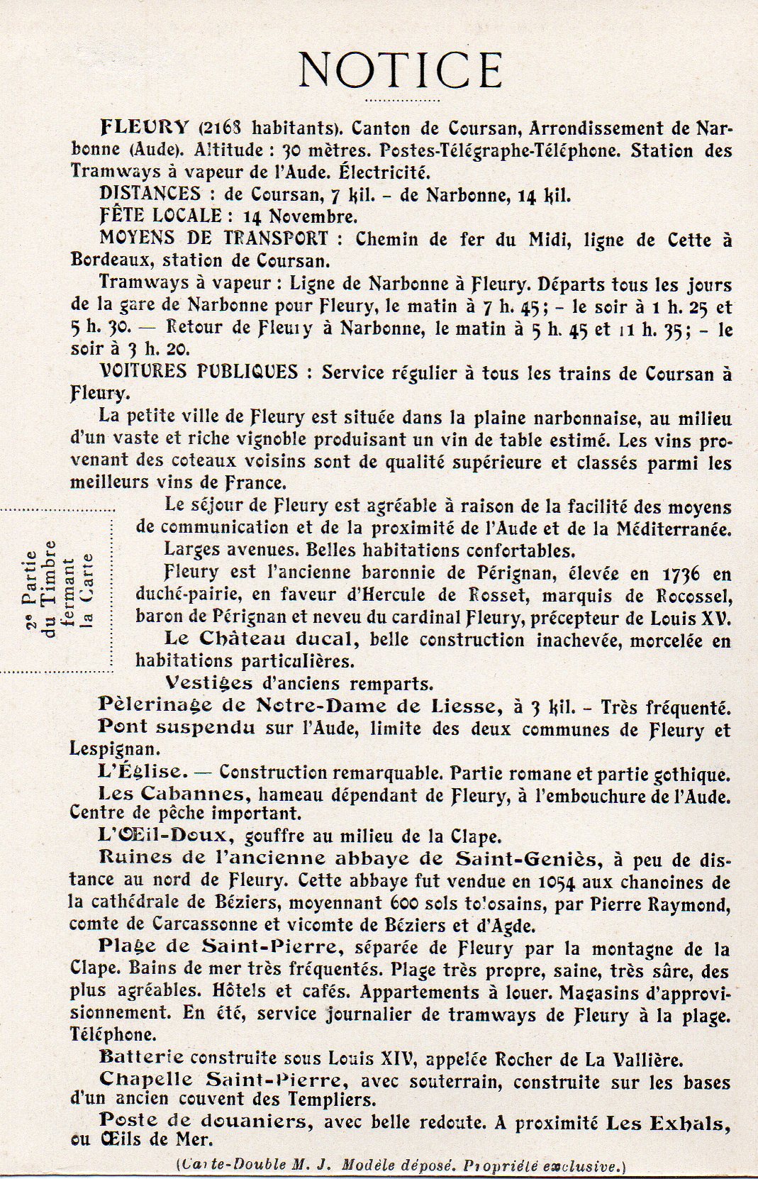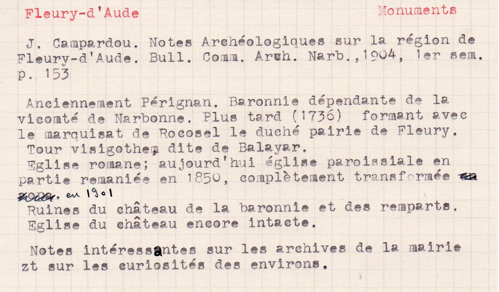 | Coursan, Fleury et la Mer | Bourrel Ch. | Coursan, Fleury | Excursion | 1903 | T. XIV | p. 63 |
