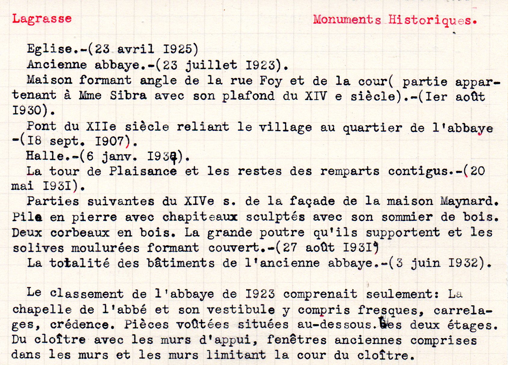 | Abbaye de Lagrasse (note et photo) | Esparseil R. | Lagrasse | Architecture religieuse | 1944 | T. XLVII | p. LVII |