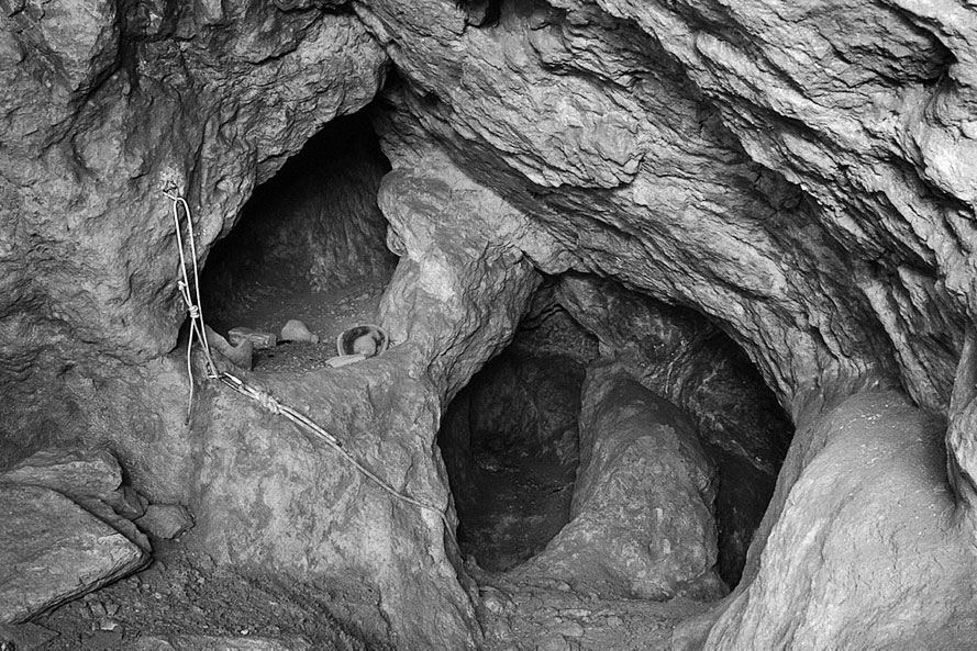 Galerie de recherche 27/1-27-2 avec niveau d’abandon (à gauche) et sommet du puits d’accès aux travaux supérieurs du Mourral de la Grave (à droite)