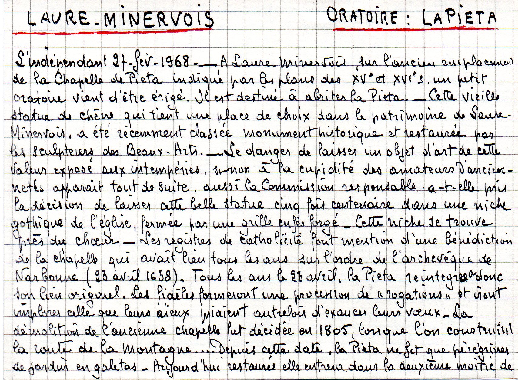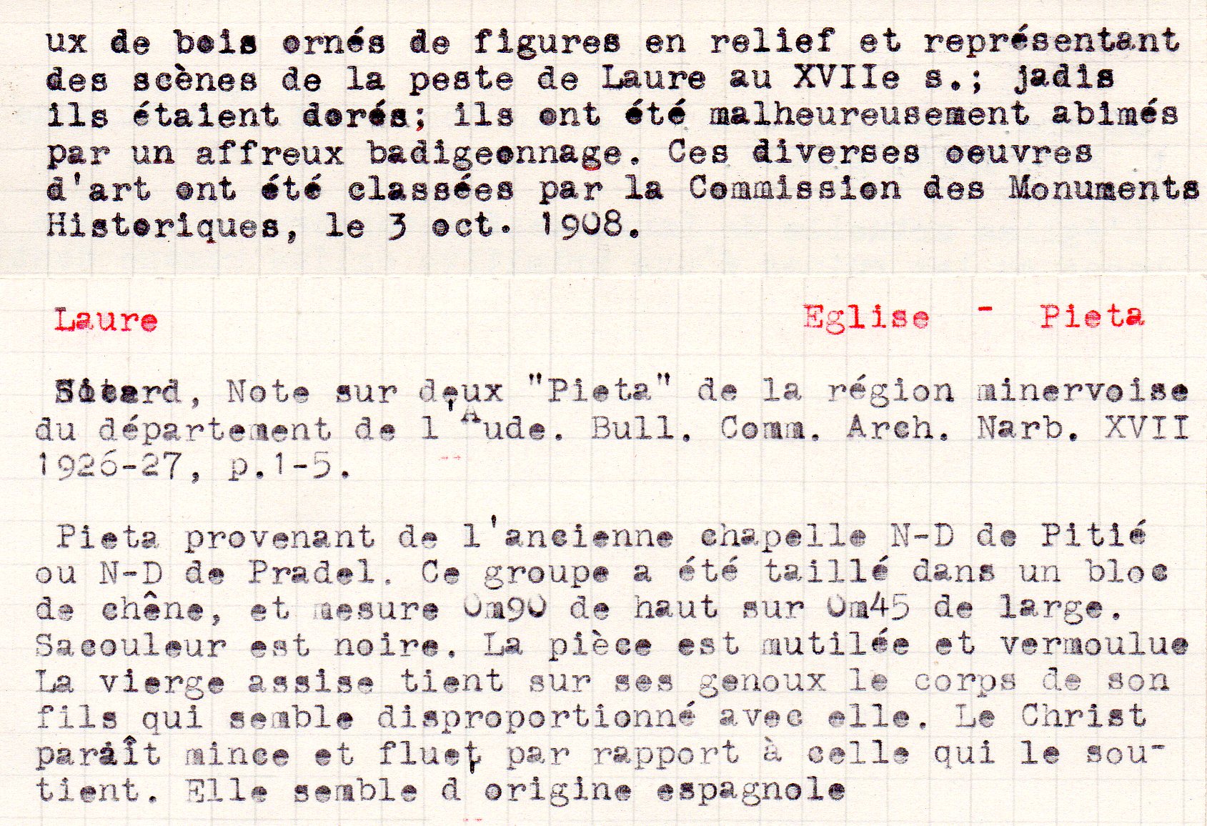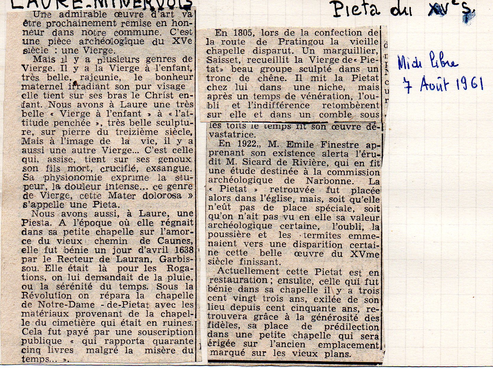 | La « Piéta » de Laure-Minervois | Journet Cl. | Laure-Minervois | Art religieux | 1961 | T. LXII | p. 153 |