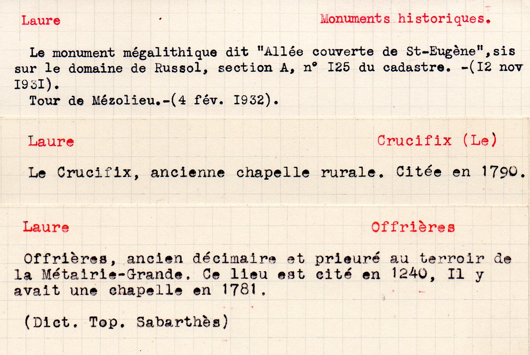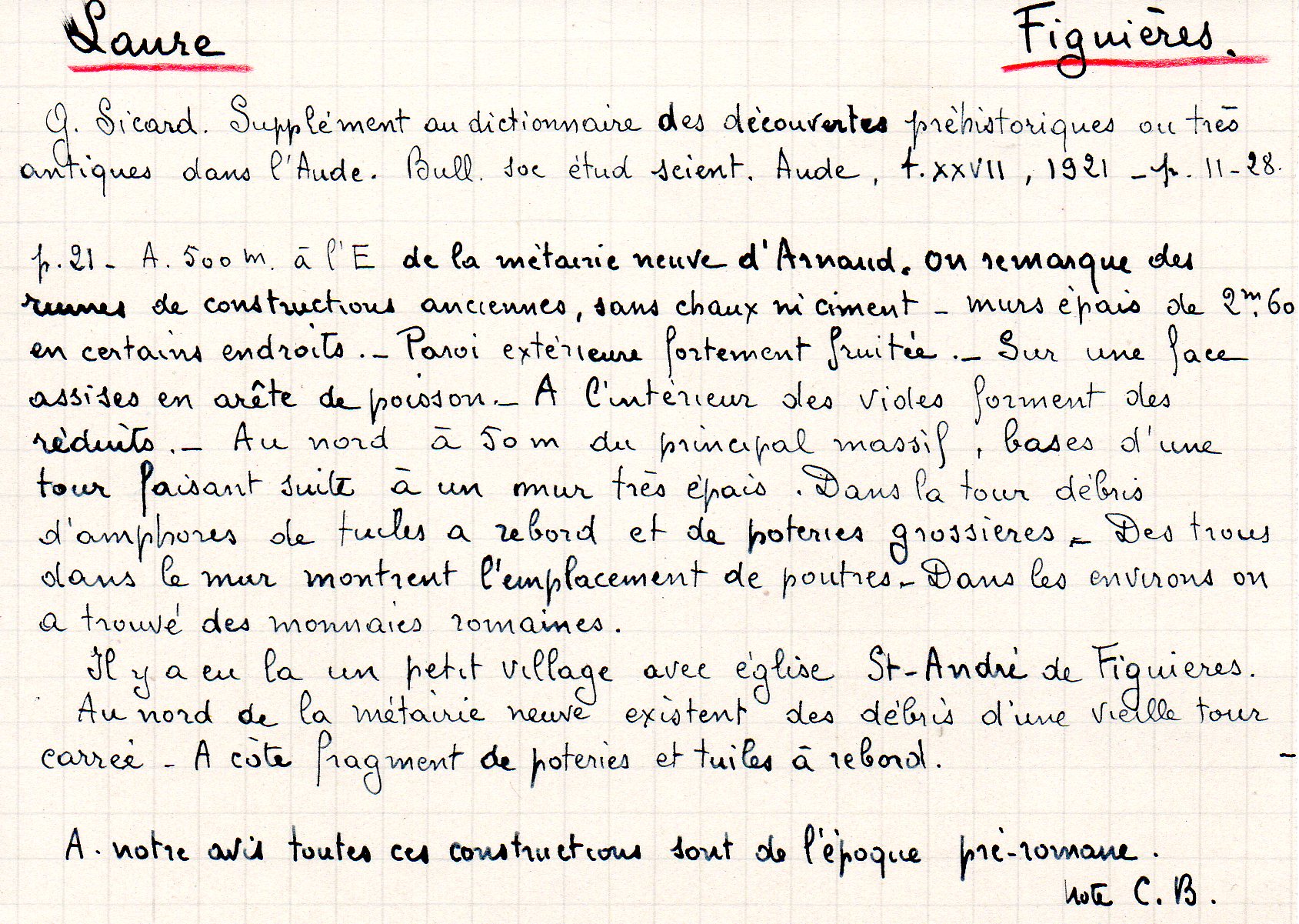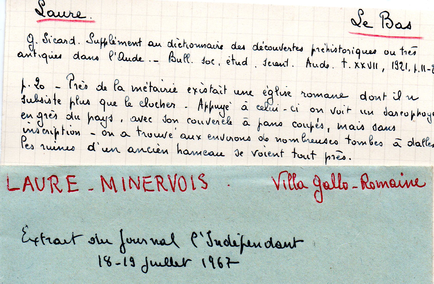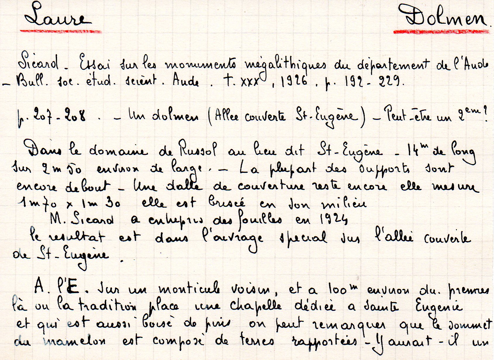 | Saint-Eugène (Laure-Minervois) | Sicard G. | Laure-Minervois | Préhistoire | 1930 | T. XXXIV | p. LXXVI et 195 |