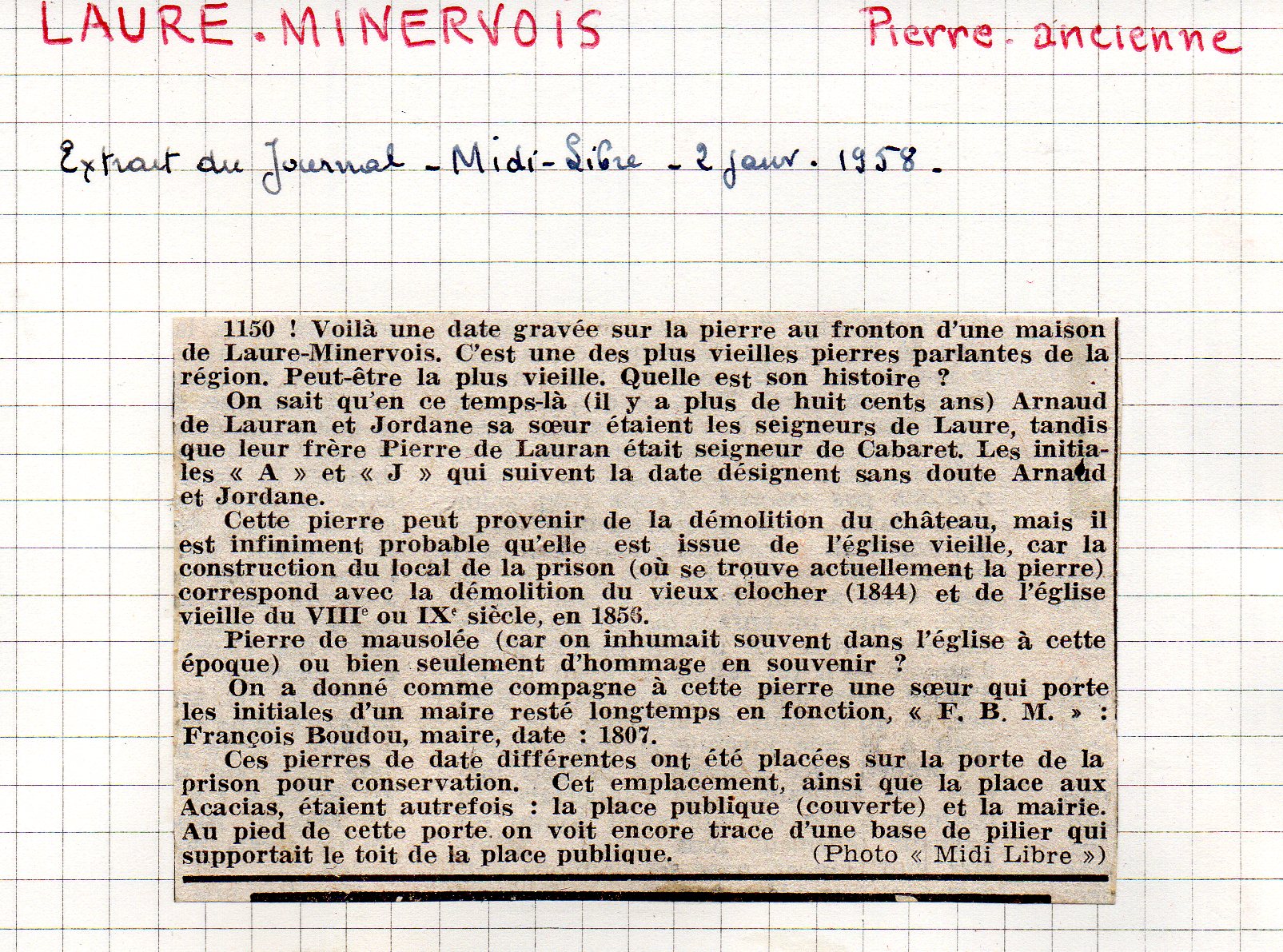 | La charte de Laure de 1318 | Journet C. | Laure-Minervois | Histoire | 1970 | T. LXX | p. 44 |