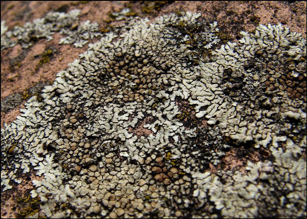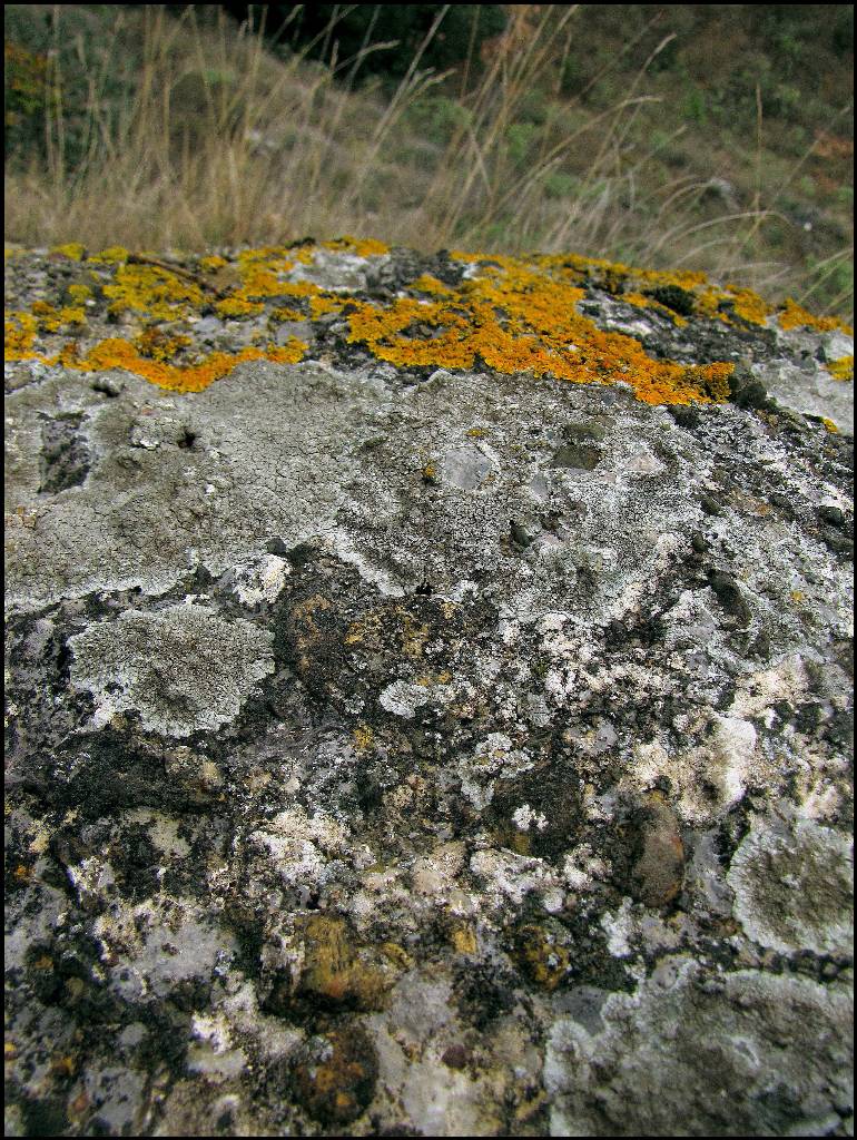 Le lichen se développe au sommet d’un bloc de grès calcaire avec Xanthoria clacicola profitant