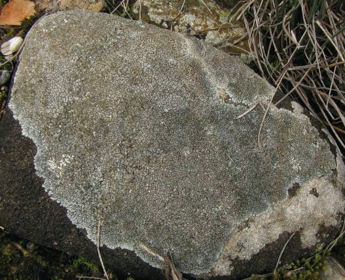 Le lichen enveloppe presque complètement un gros galet émergeant du sol.