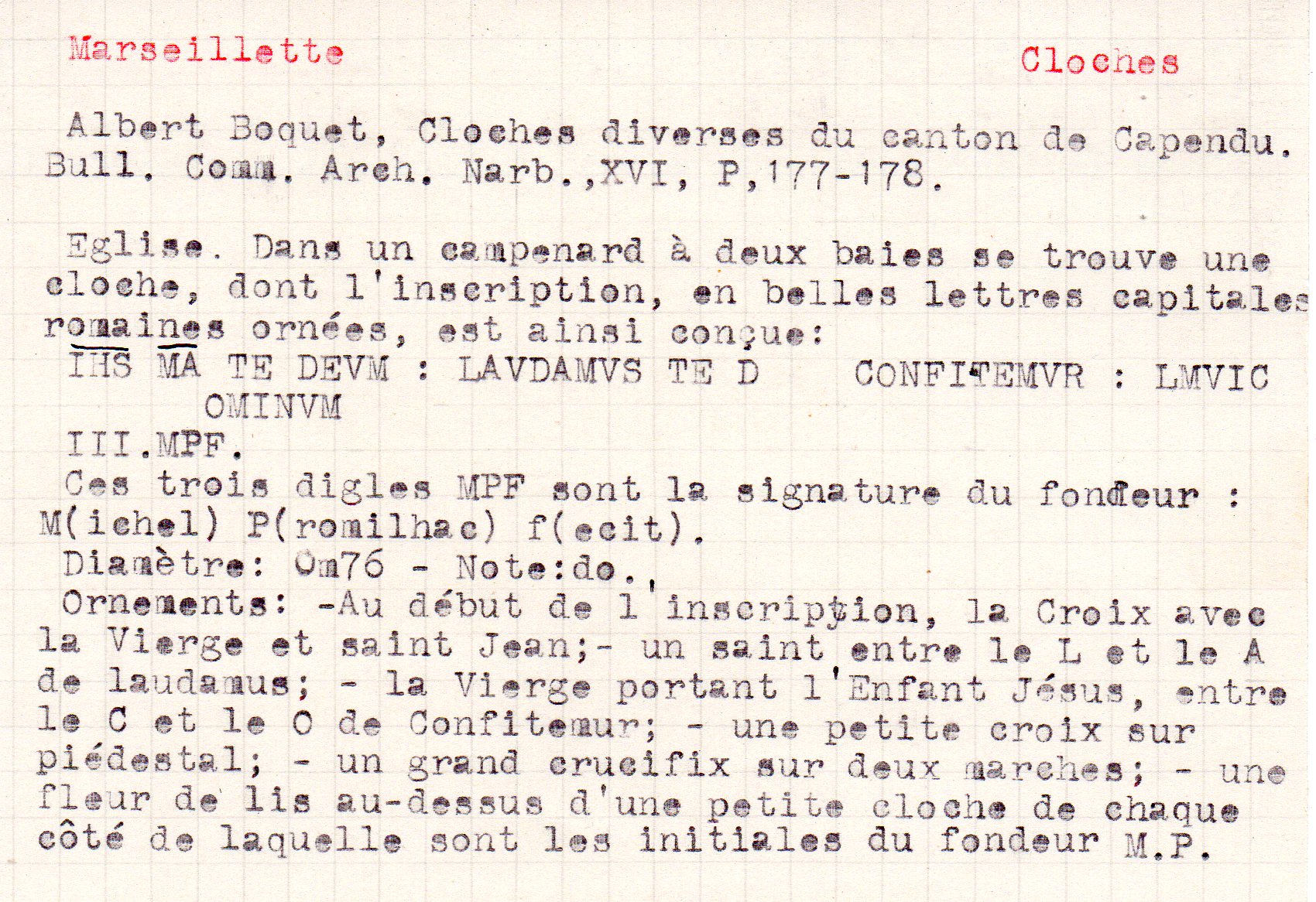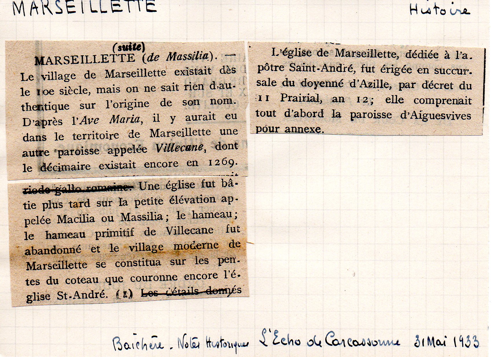 | Objets gallo-romains à Marseillette | Courrent P. | Marseillette | Archéologie | 1932 | T. XXXVI | p. LXXIV |