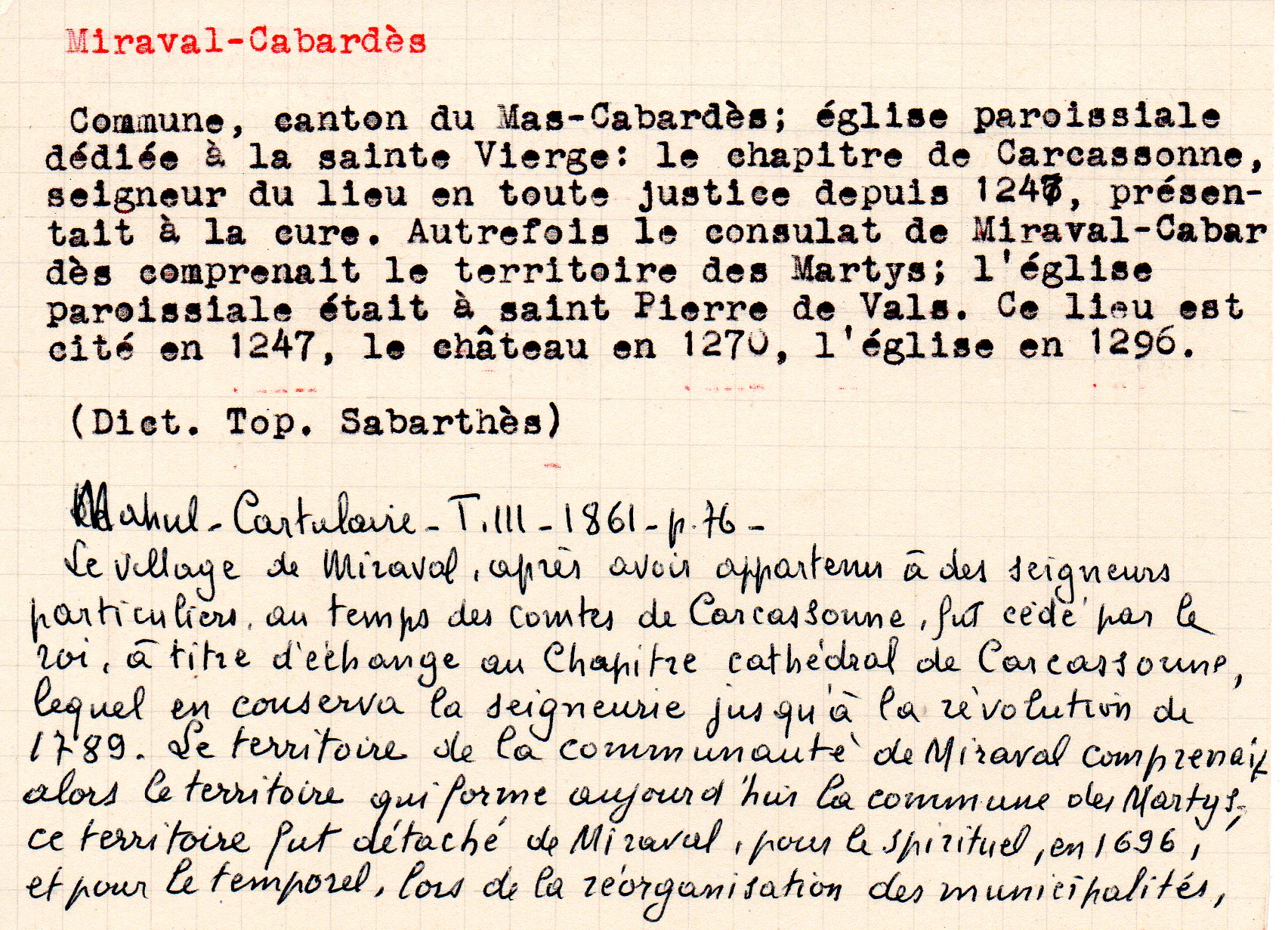 | Anciennes bornes limitrophes : Hautpoul, consulat de Miraval-Cabardès | Marty-Séguy | Miraval-Cabardès | Histoire | 1963 | T. LXIV | p. 337 |
