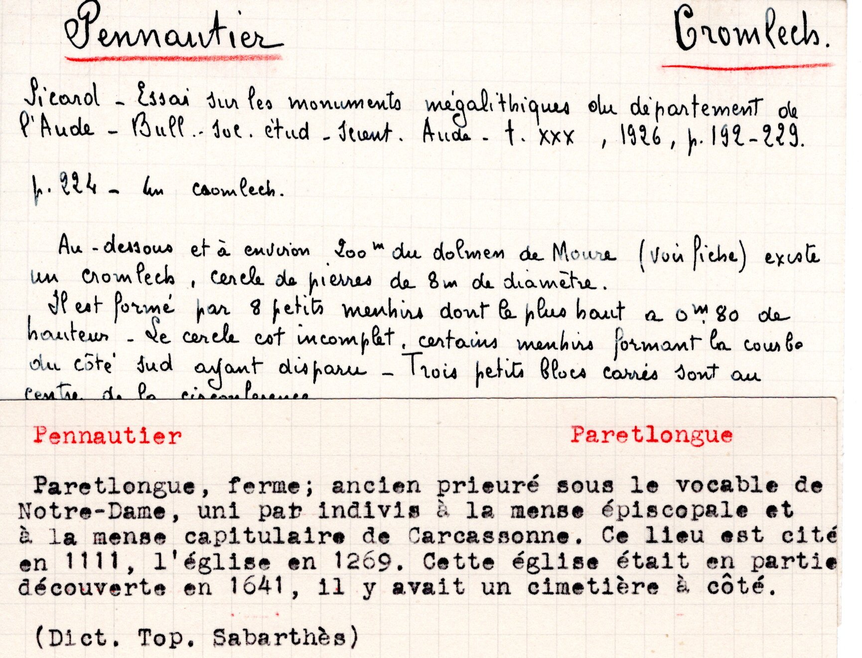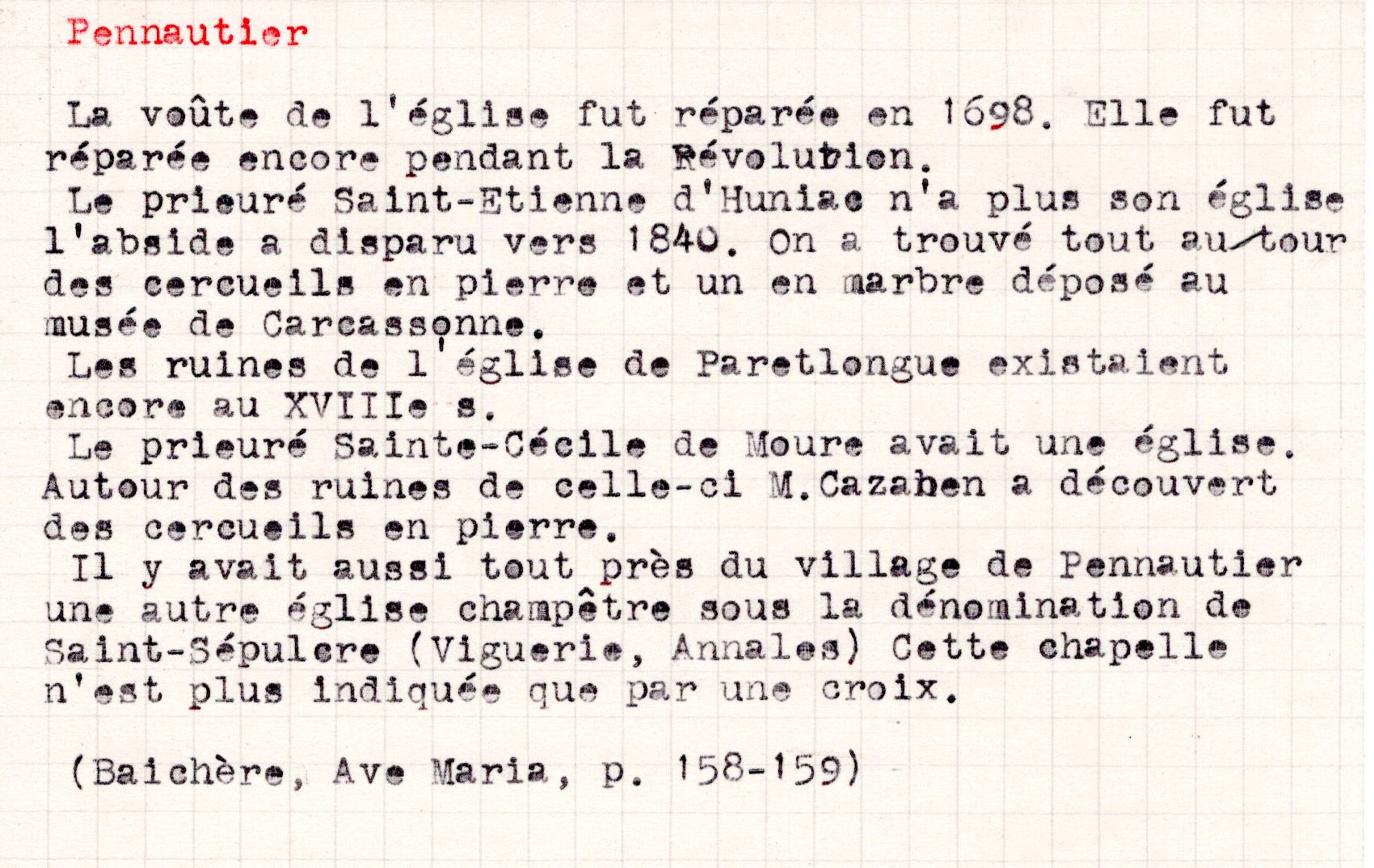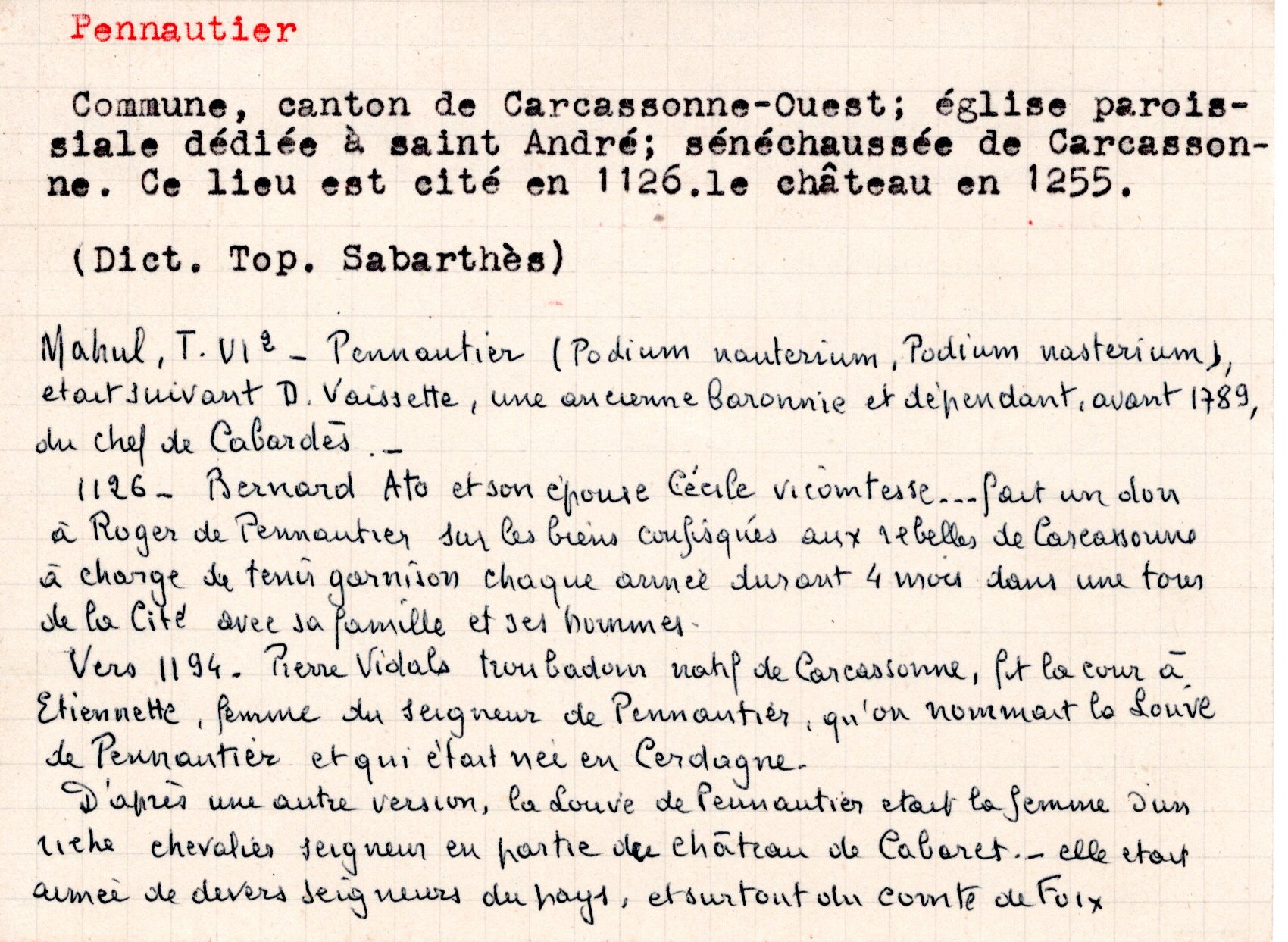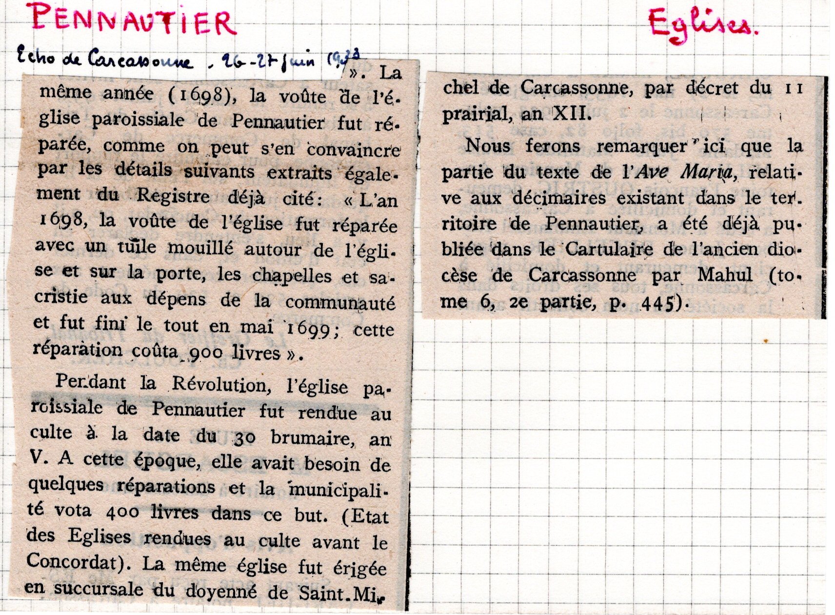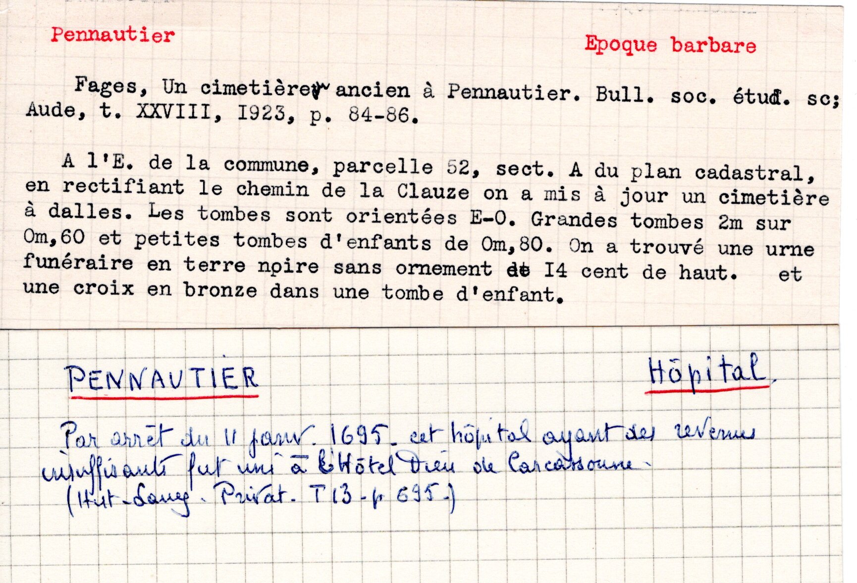 | Pennautier et Paretlongue | Courrent P. | Pennautier, Paretlongue | 1930 | T. XXXIV | p. 41 | |