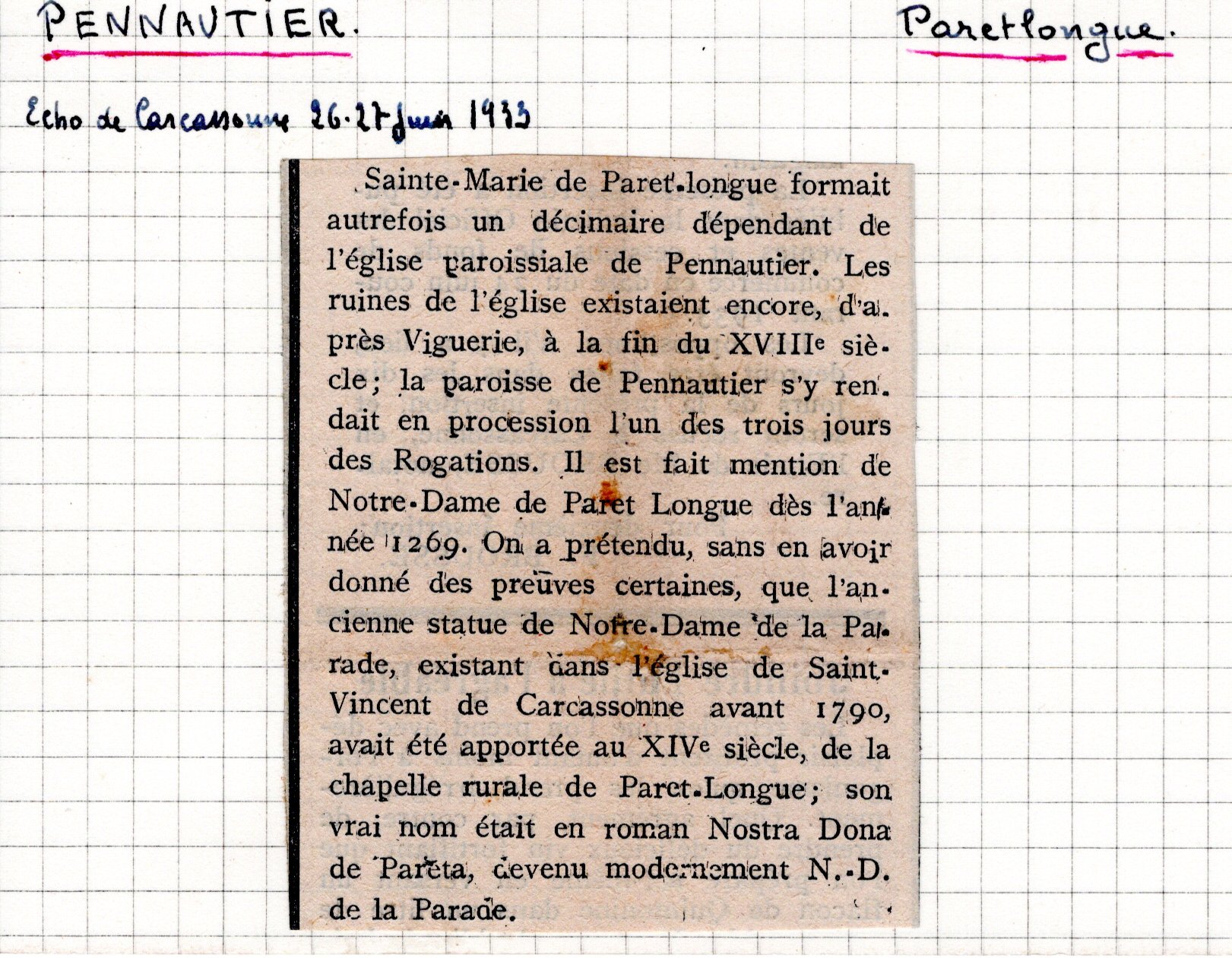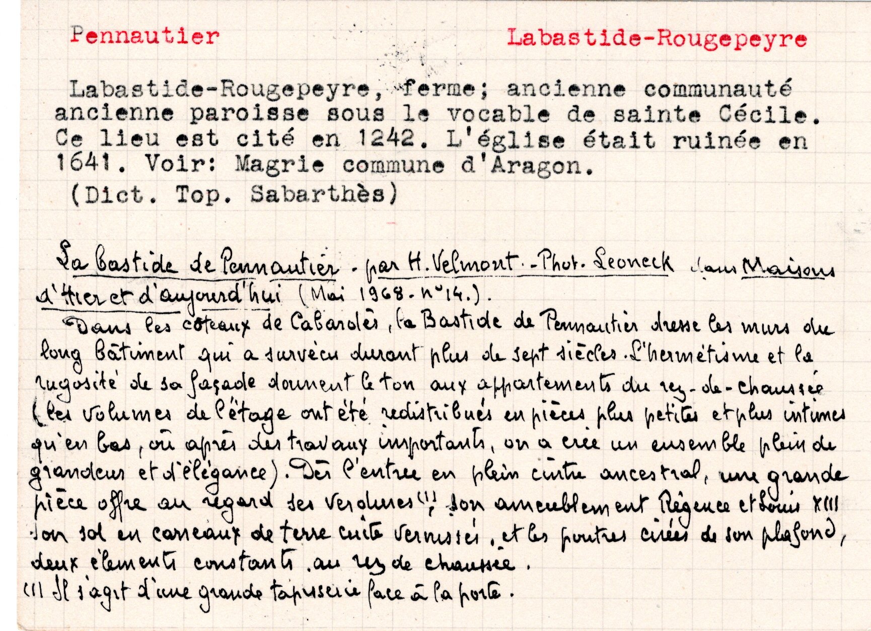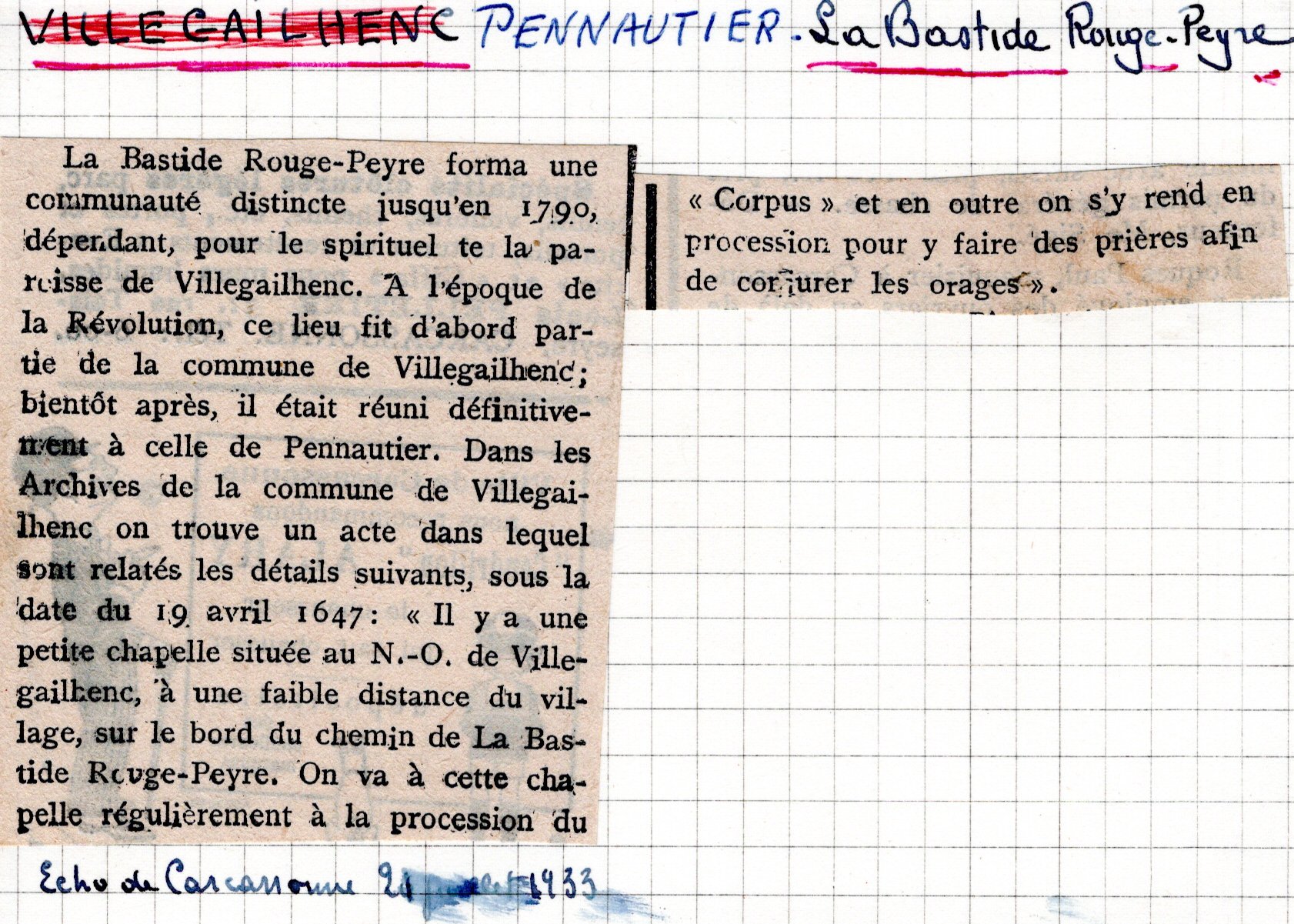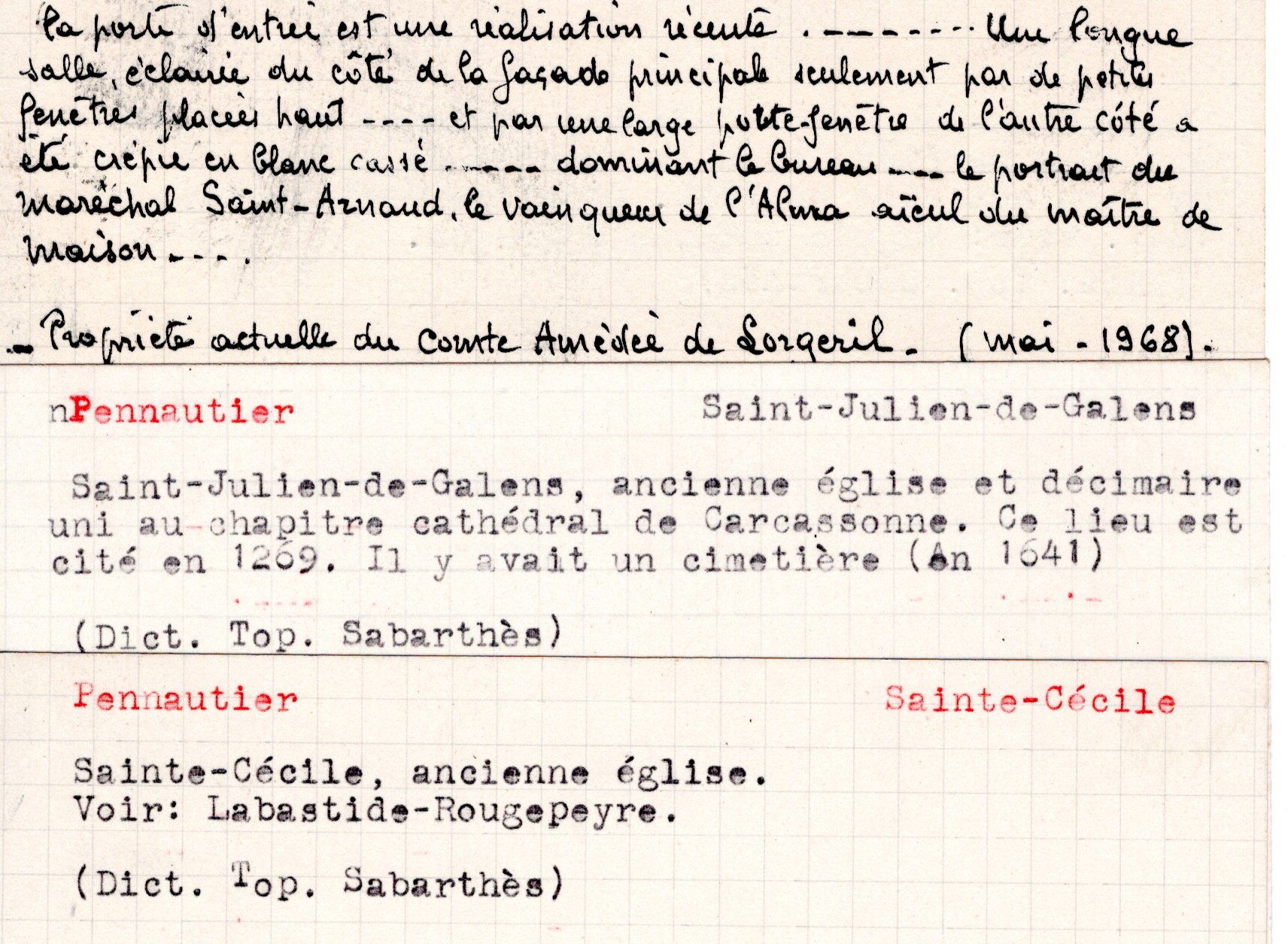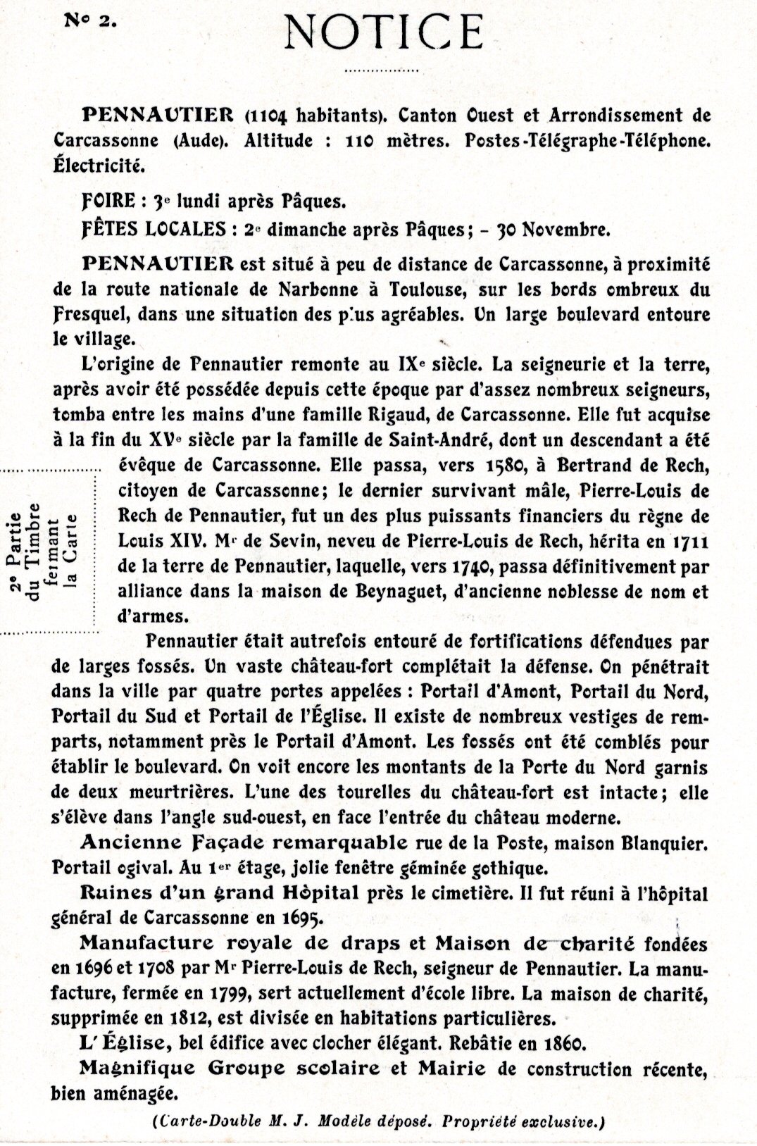 | Pennautier et Paretlongue | Courrent P. | Pennautier, Paretlongue | 1930 | T. XXXIV | p. 41 | |