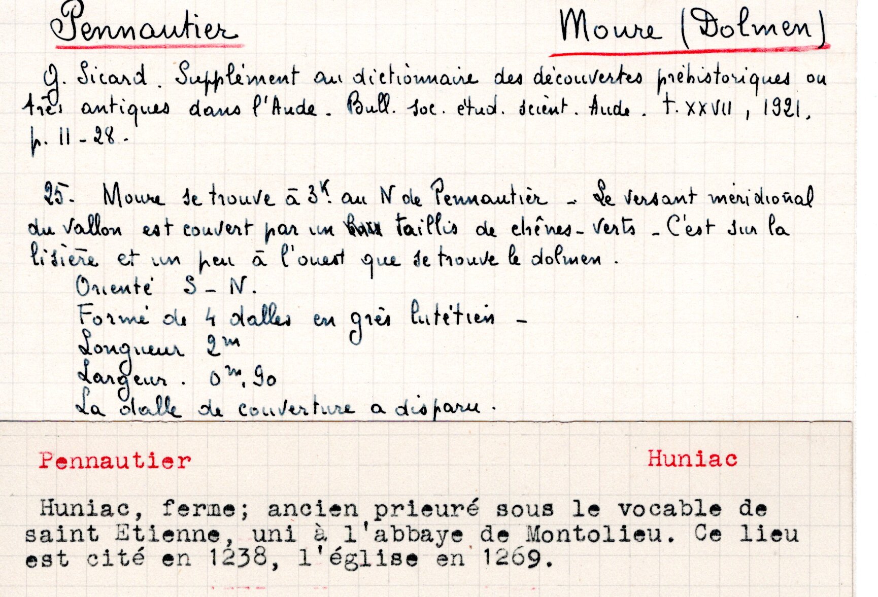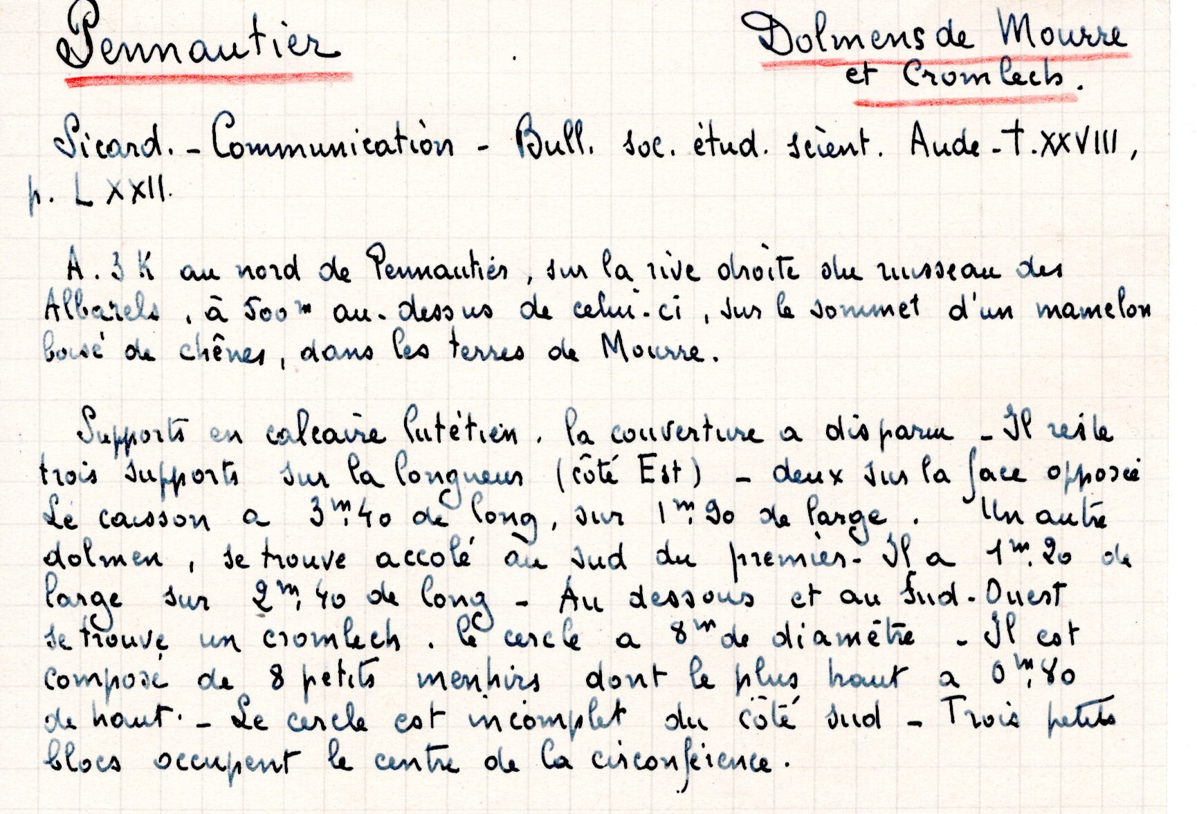 | Dolmen de Moure | Fages A. | Pennautier | Mégalithe | 1918 | T. XXVI | p. LXIV |