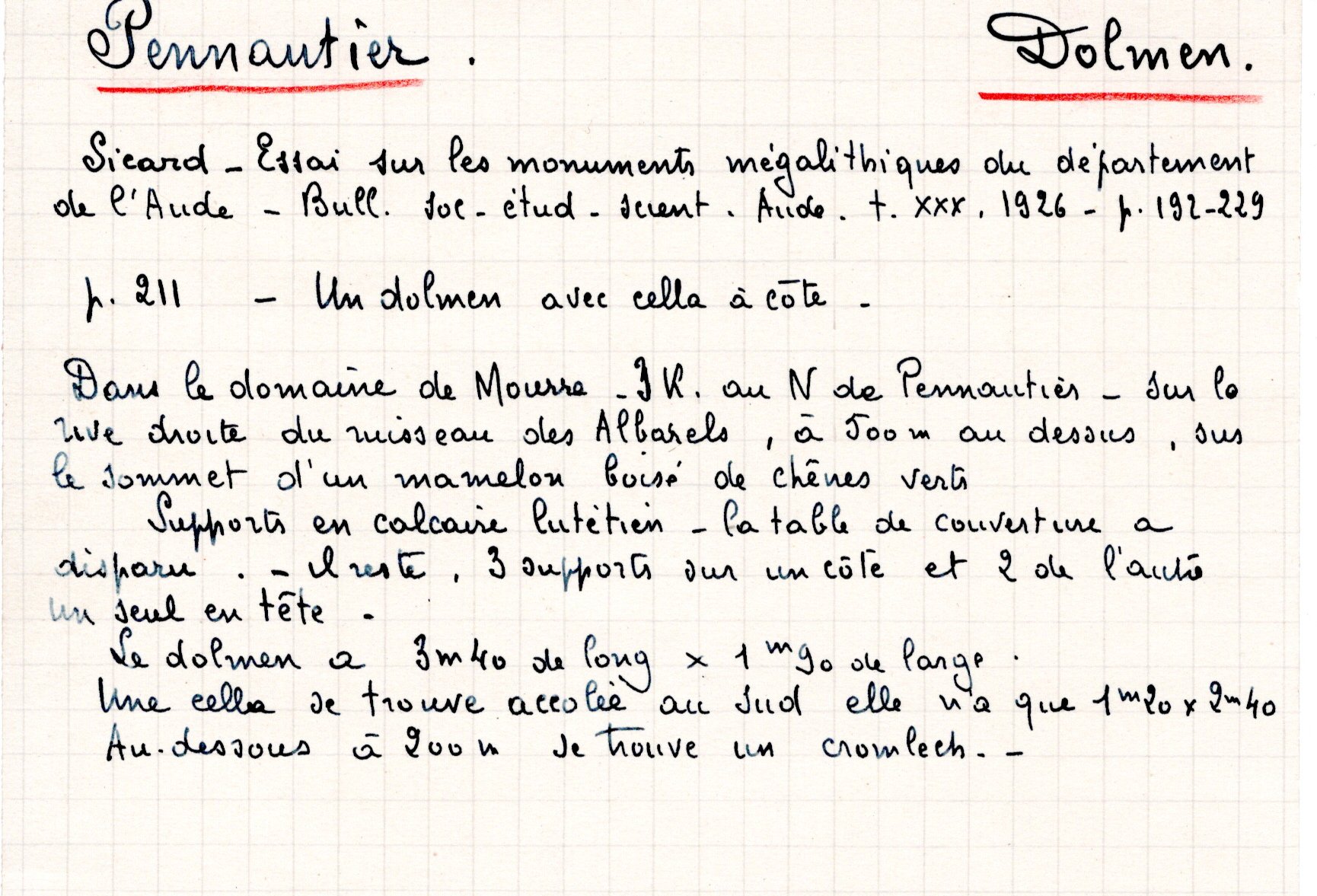 | Dolmen de Pennautier | Fages A., Sicard G. | Pennautier | Mégalithe | 1923 | T. XXVIII | p. LXXII |