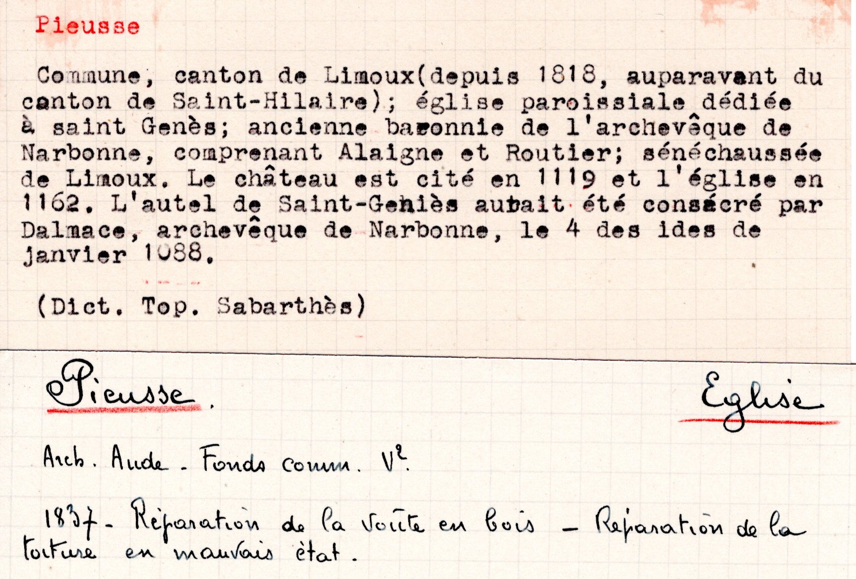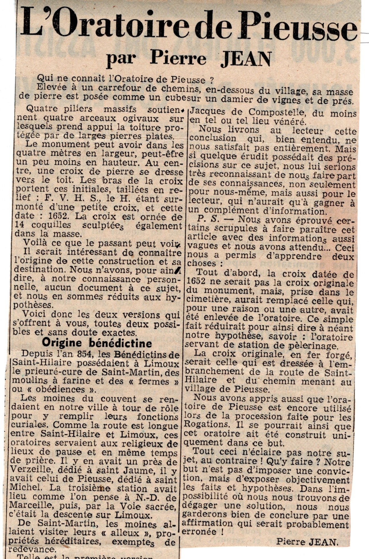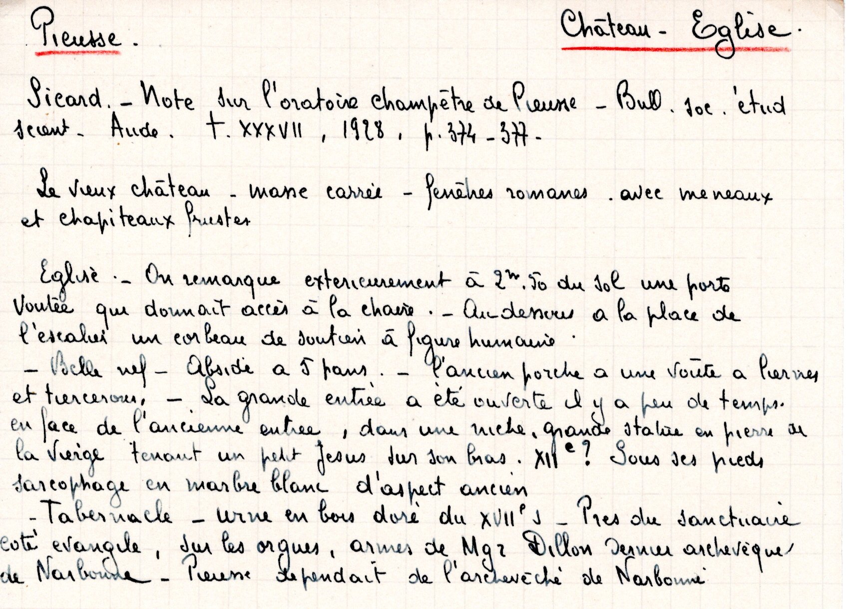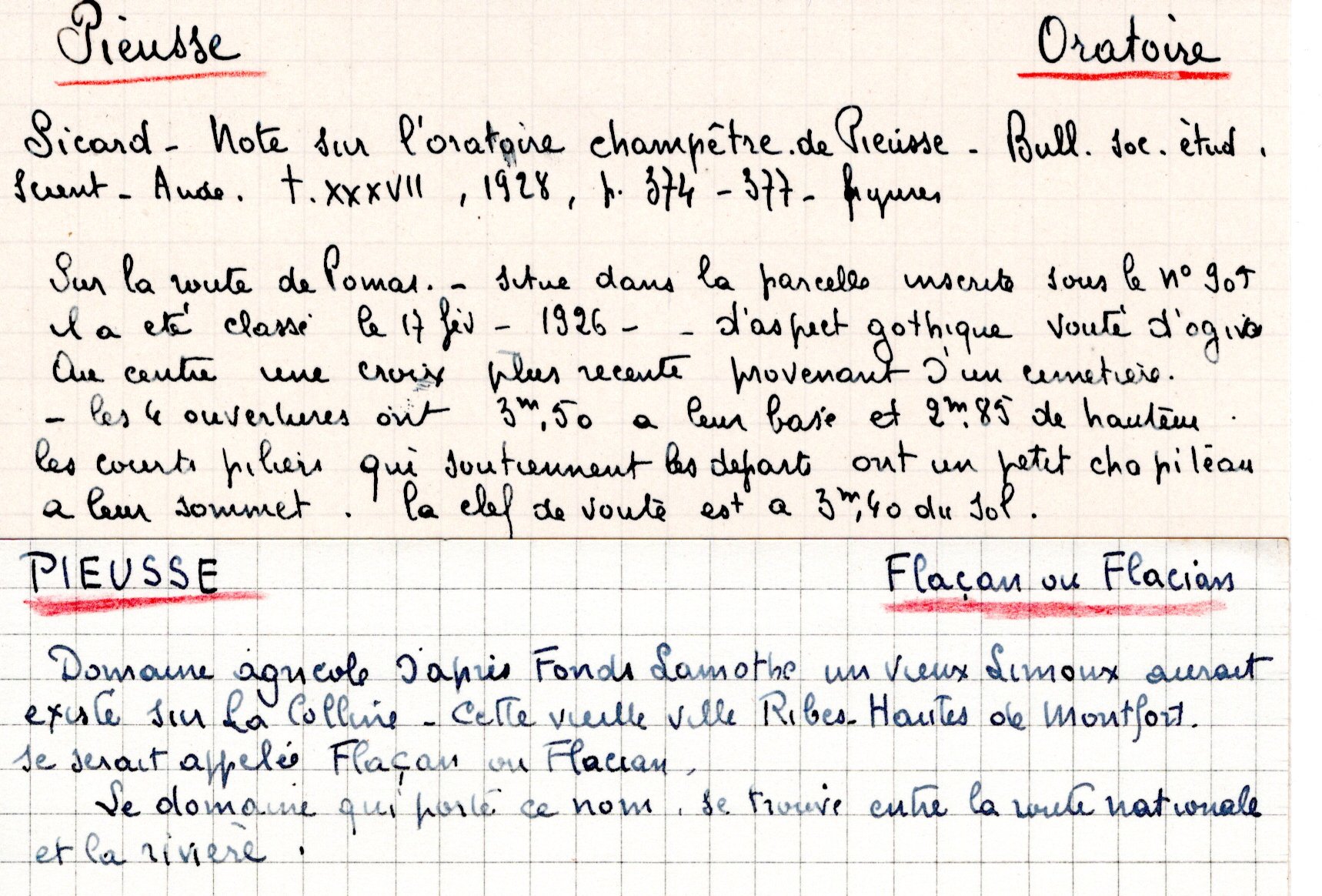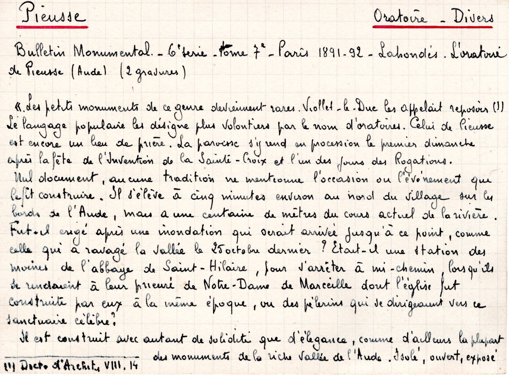 | Oratoire de Pieusse | Sicard G. | Pieusse | Architecture religieuse | 1928 | T. XXXII | p. 374 |