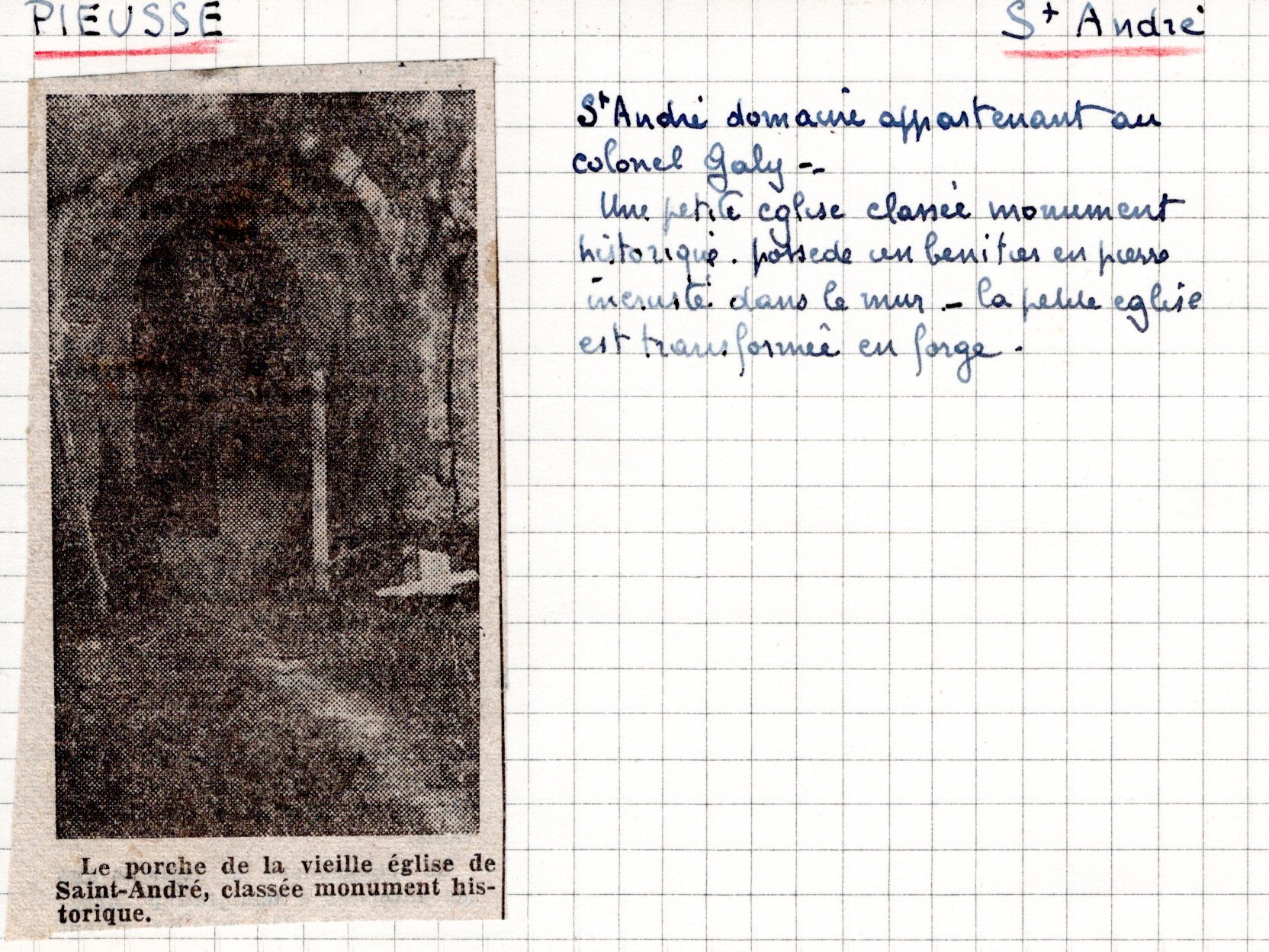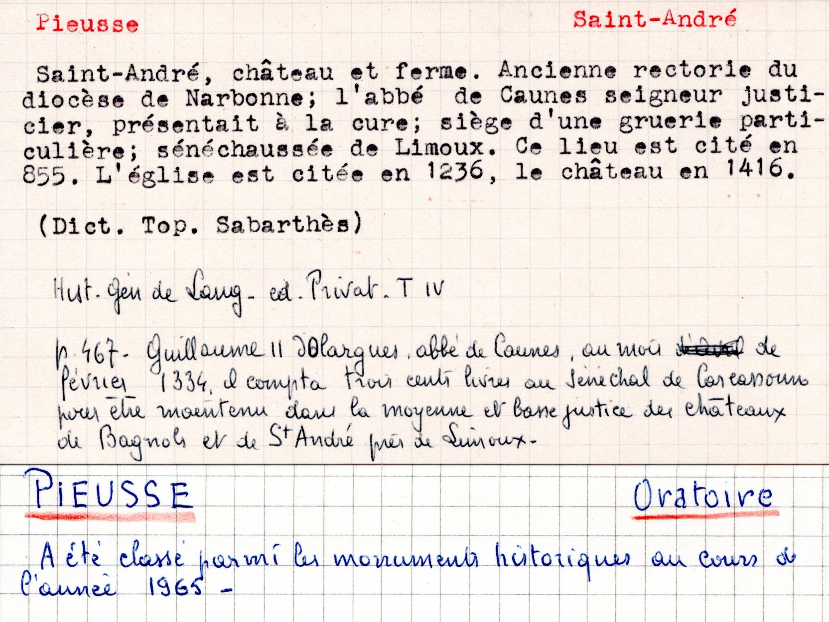 | Le château et la chapelle de St-André à Pieusse | Labarre A. | Pieusse | Histoire religion | 1977 | T. LXXVII | p. 123 |