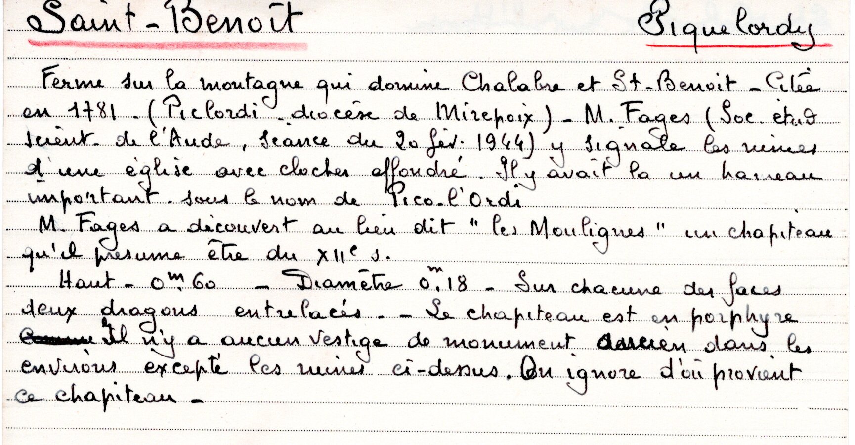| Chapiteau roman | Fages A. | Saint-Benoit | Architecture religieuse | 1944 | T. XLVII | p. LXX |