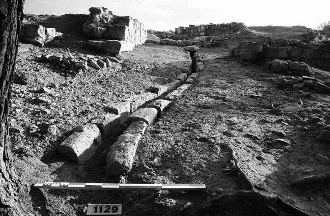 Vue depuis le sud du caniveau débouchant depuis la porte principale où ont été mises au jour des stèles en réemploi.