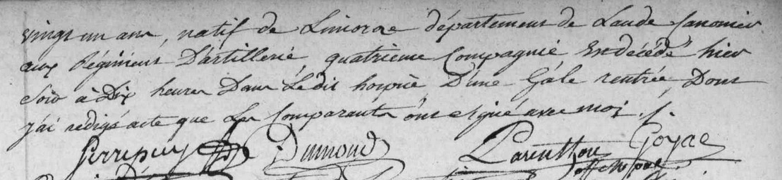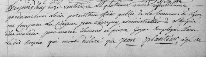 Le dépouillement de registres d’état civil de Lyon, à la date du 11 ventôse An IV, concerne un natif de Limoux, Jean Plantier, 21 ans, canonier au régiment d’Artillerie, décédé à Lyon :