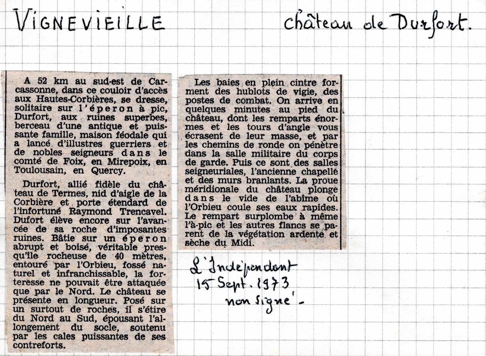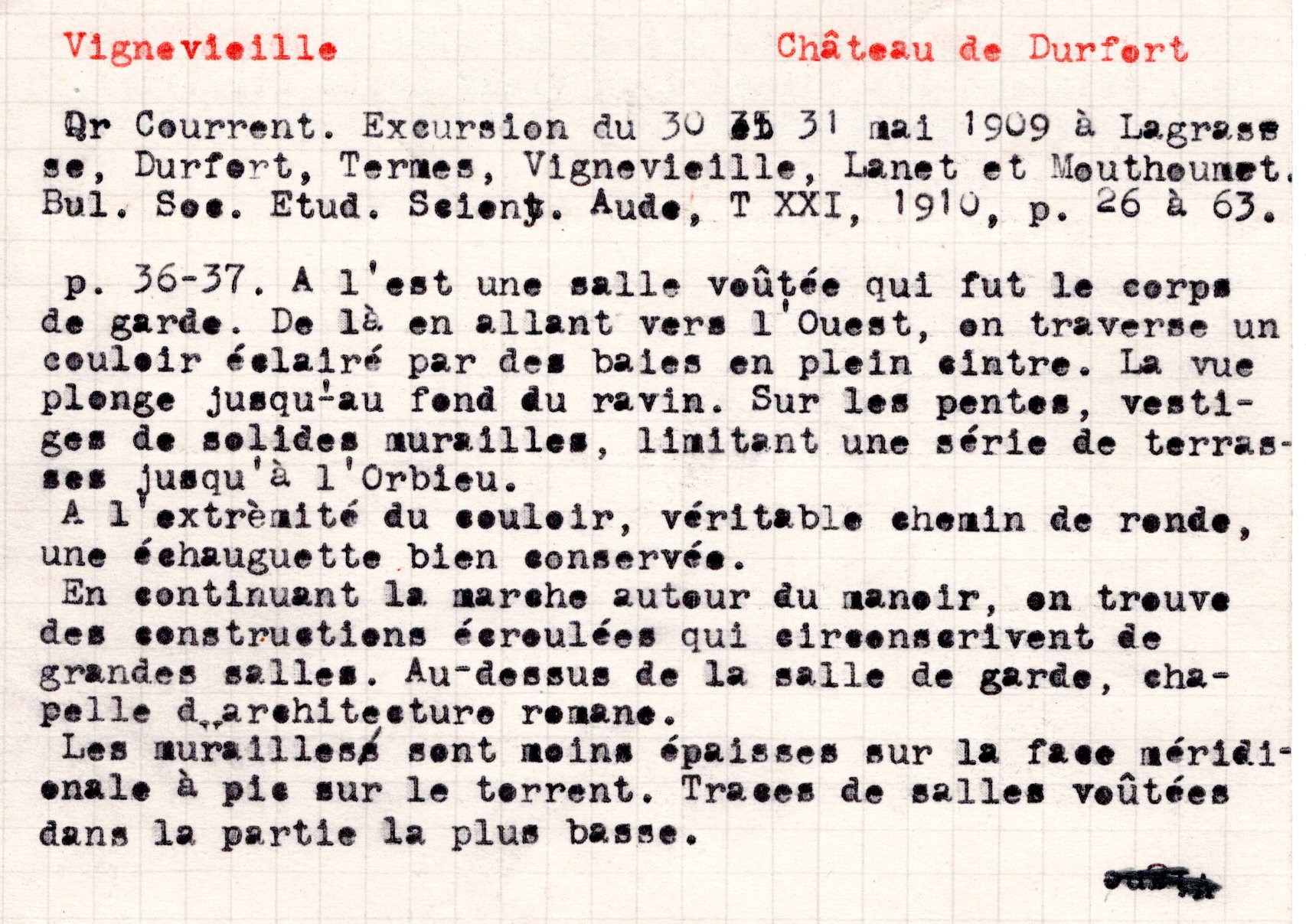 | Lagrasse, Durfort, Termes, Vignevieille, Mouthoumet. | Courrent P. | Lagrasse, Durfort, Termes, Vignevieille | Excursion | 1910 | T. XXI | p. 26 |