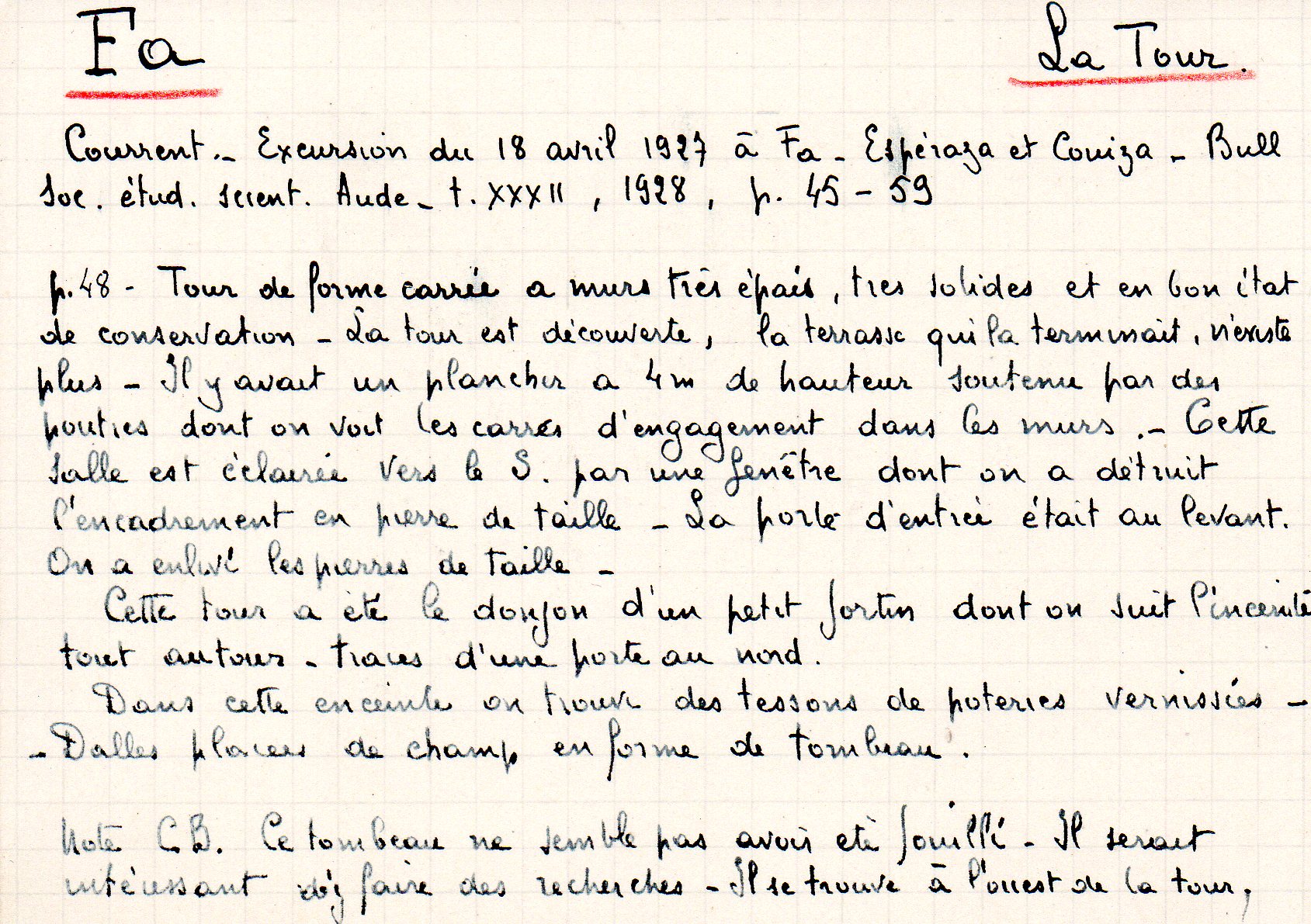 | Espéraza, Couiza, Fa (Excursion) Compte-rendu historique | Courrent P. | Espéraza, Couiza, Fa | Excursion | 1928 | T. XXXII | p. 48 |